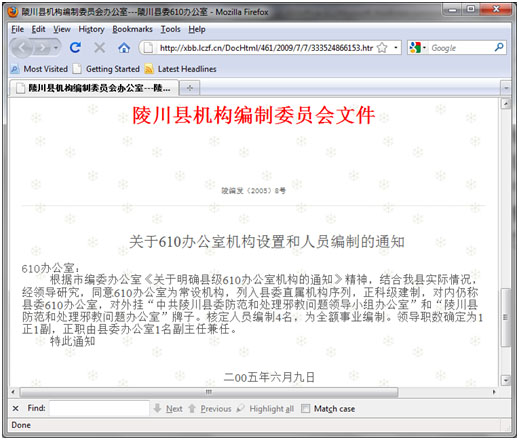 例三,山东省惠民县孙武镇610办公室于2010年5月12日正式挂牌成立(见下面的网络截图)  山东省惠民县孙武镇610办公室于2010年5月12日正式挂牌成立(网络截图) |