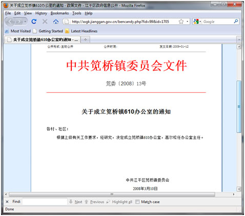 由于“610办公室”这个名字名声太坏了,后来中共为了欺骗外界,加挂了“防范和处理邪教问题领导小组办公室”的牌子。实际上是换汤不换药,610在内部的名称一直没有改变。例如上图的山西省陵川县机构编制委员会文件规定,610办公室对外挂两个牌子,一个是陵川县党委“中共陵川县委防范和处理邪教问题领导小组办公室”,一个是“陵川县防范和处理邪教问题领导小组办公室”,对内仍然称县委610办公室。 五、非法610组织深入到基层 在中央610办公室的策动和压力下,各省、市、县,甚至乡(镇)、街道居委会都设立了由专人负责的 610分支机构。近年来,基层610组织还在继续发展。 例一:浙江省杭州市江干区笕桥镇在2008年3月通知成立镇610办公室(见下面的网络截图)  浙江省杭州市江干区笕桥镇在2008年3月通知成立镇610办公室(网络截图) |
