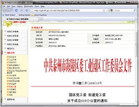 例二:江苏省泰州市海陵区工业园区工委办公室在2008年3月通知成立610办公室(见下面的网络截图)。  江苏省泰州市海陵区工业园区工委办公室在2008年3月通知成立610办公室(网络截图) |