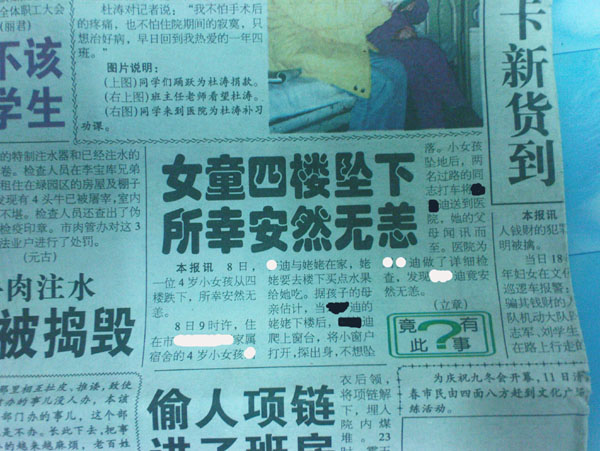 | 【明慧网二零一零年七月二十日】四岁的小迪迪,经常在姥姥家玩。姥姥是法轮功学员,她经常跟姥姥学法听李洪志师父的讲法录音带,身体变化很大。小迪迪从不感冒,十分聪明可爱。四岁的小迪迪经常跟姥姥一起听李洪志师父讲法 1999年1月8日早上,她跟姥姥在家,姥姥要到楼下去买水果。姥姥跟她说,让她自己在家玩,一会儿就回来。姥姥的这种做法在中国是常见的。不幸的是,小迪迪的姥姥下楼后,迪迪就爬上窗口(四楼),把窗台上的花搬开,将小窗户打开,探出身子,并不慎坠落。 两个过路的人打车将孩子送到医院,其中一人口述,“当时感觉一团棉花包从上而降,落地后哭啦,才发现是个孩子。”迪迪的父母闻讯而来。医院为小迪迪做了详细检查,发现孩子竟安全无恙。 事后孩子告诉姥姥说:“我看见法轮把我接住啦!”姥姥听到一下就明白啦,“是慈悲伟大的师父,救了我的外孙女,要不孩子肯定没命啦!真是奇迹啊!” 事后,这消息登了报纸。