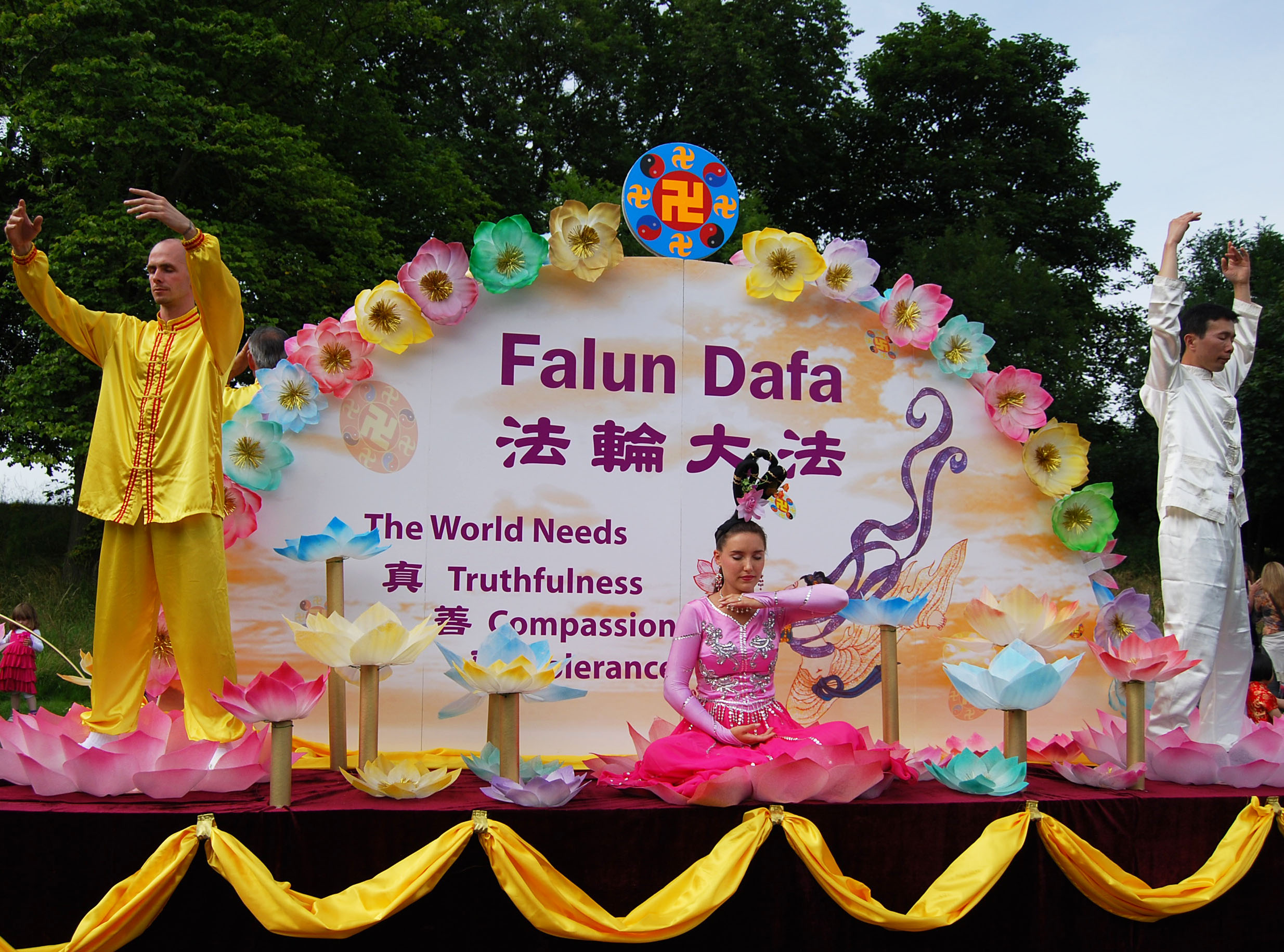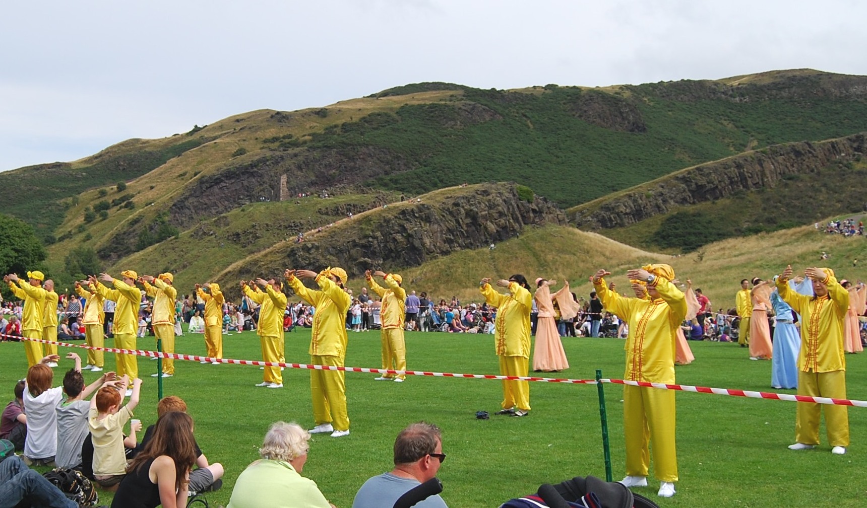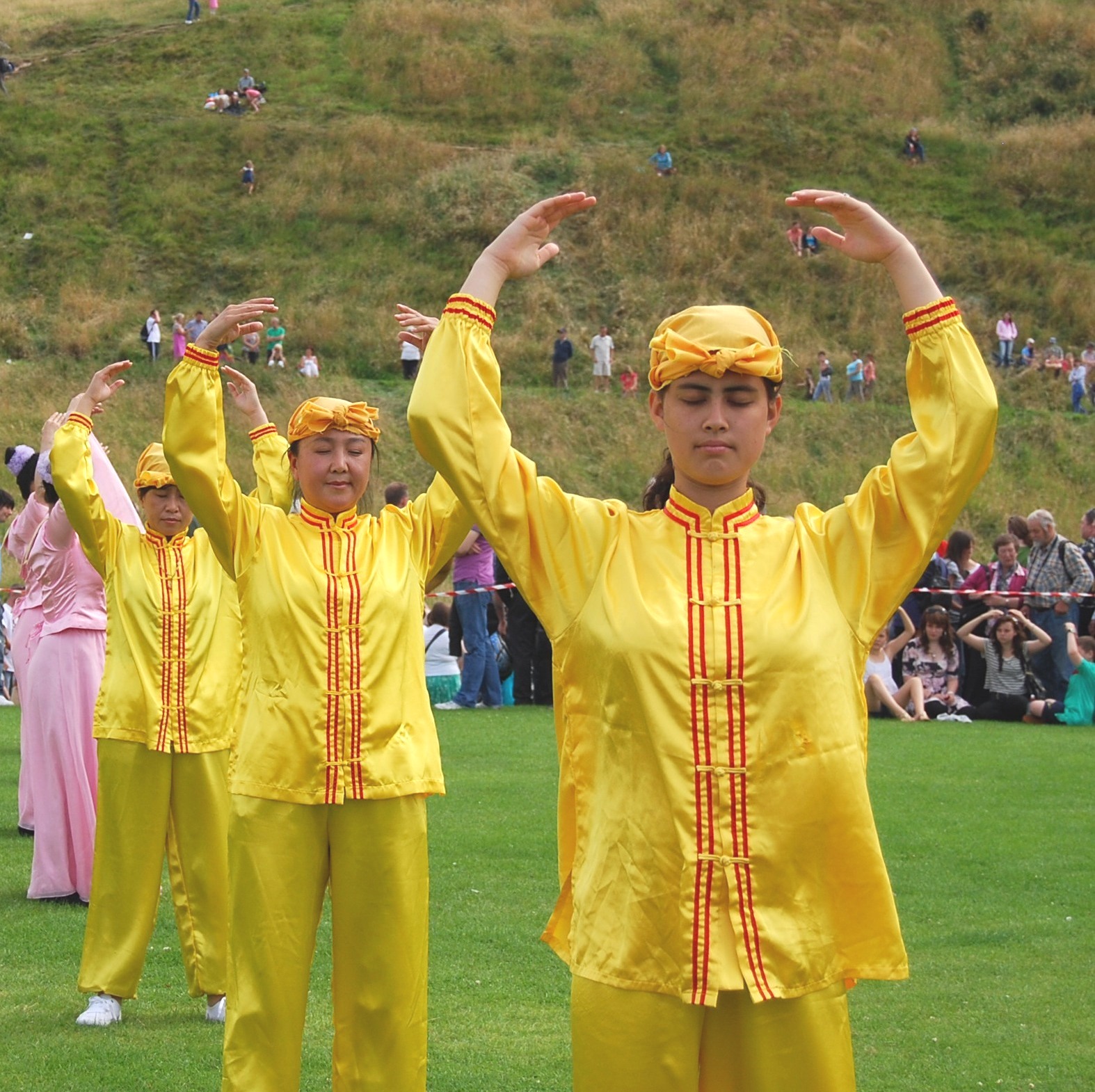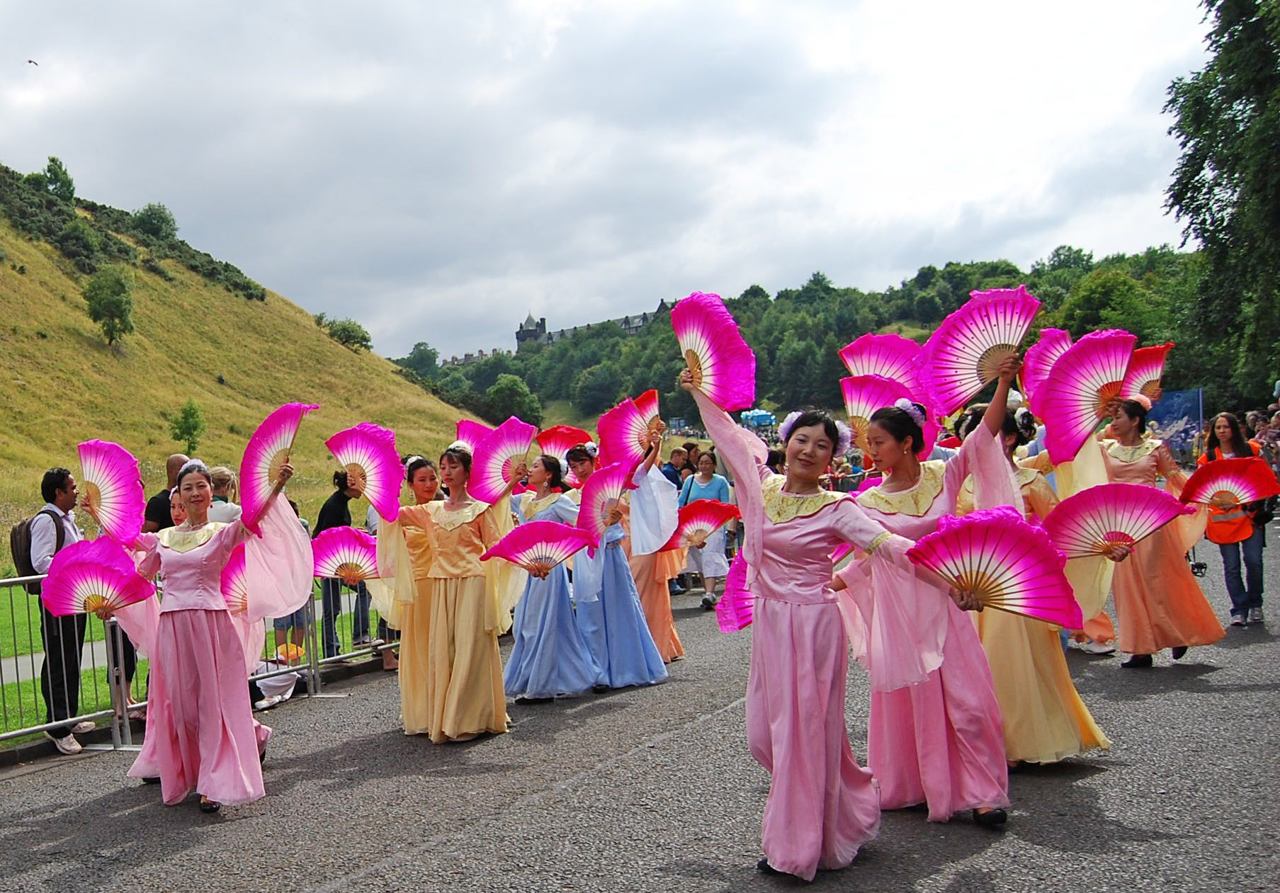 大游行的第二天,八月九日,苏格兰第一大报《苏格兰人报》(The Scotsman)在头版头条位置刊登了法轮功团队的大幅照片,并配以说明:“中国人照亮了爱丁堡艺术节大游行!法轮大法(学员)自二零零二年来每年参加爱丁堡艺术节大游行,照片中是法轮大法团队里的舞蹈表演者,他们为昨天的爱丁堡艺术节大游行增添了勃勃生机。”  法轮功女学员组成的绸扇舞队 |