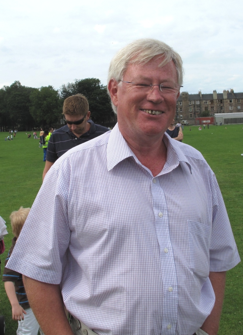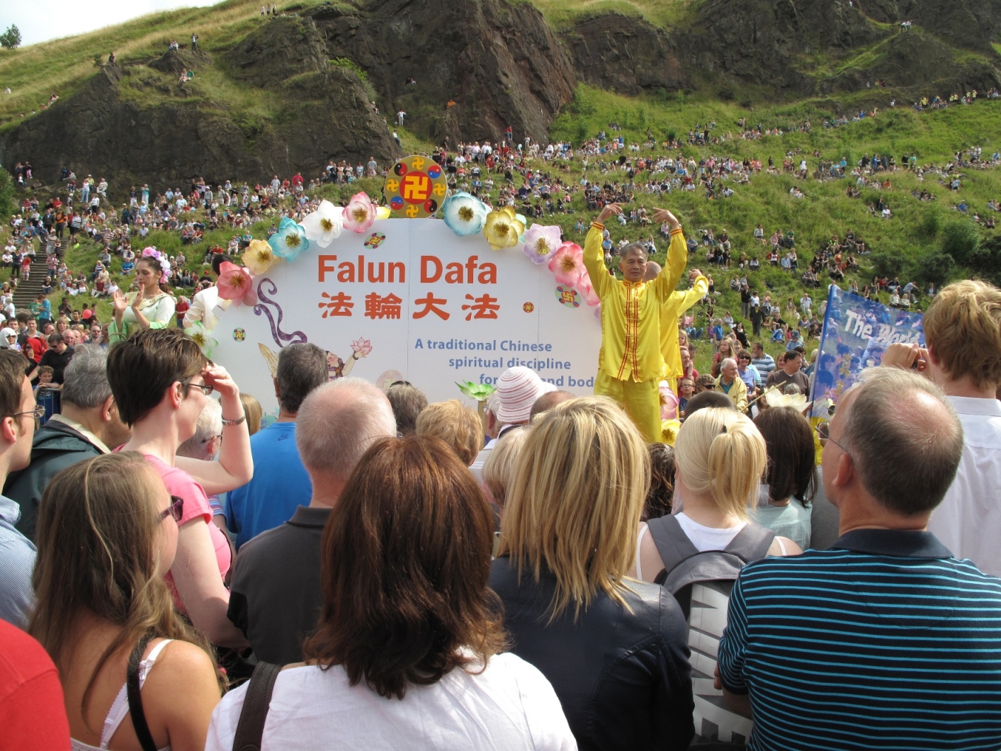 游行结束后,按活动主办方的安排,法轮功学员们在终点附近的大草坪再次为观众展示功法。  爱丁堡居民理查德感到法轮功有很强的能量场 |