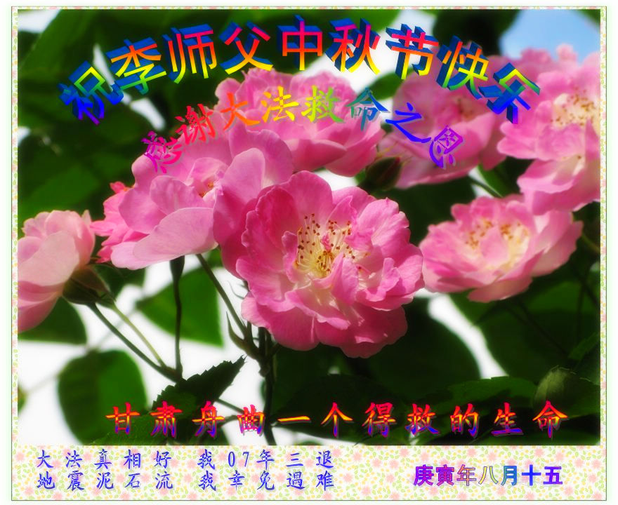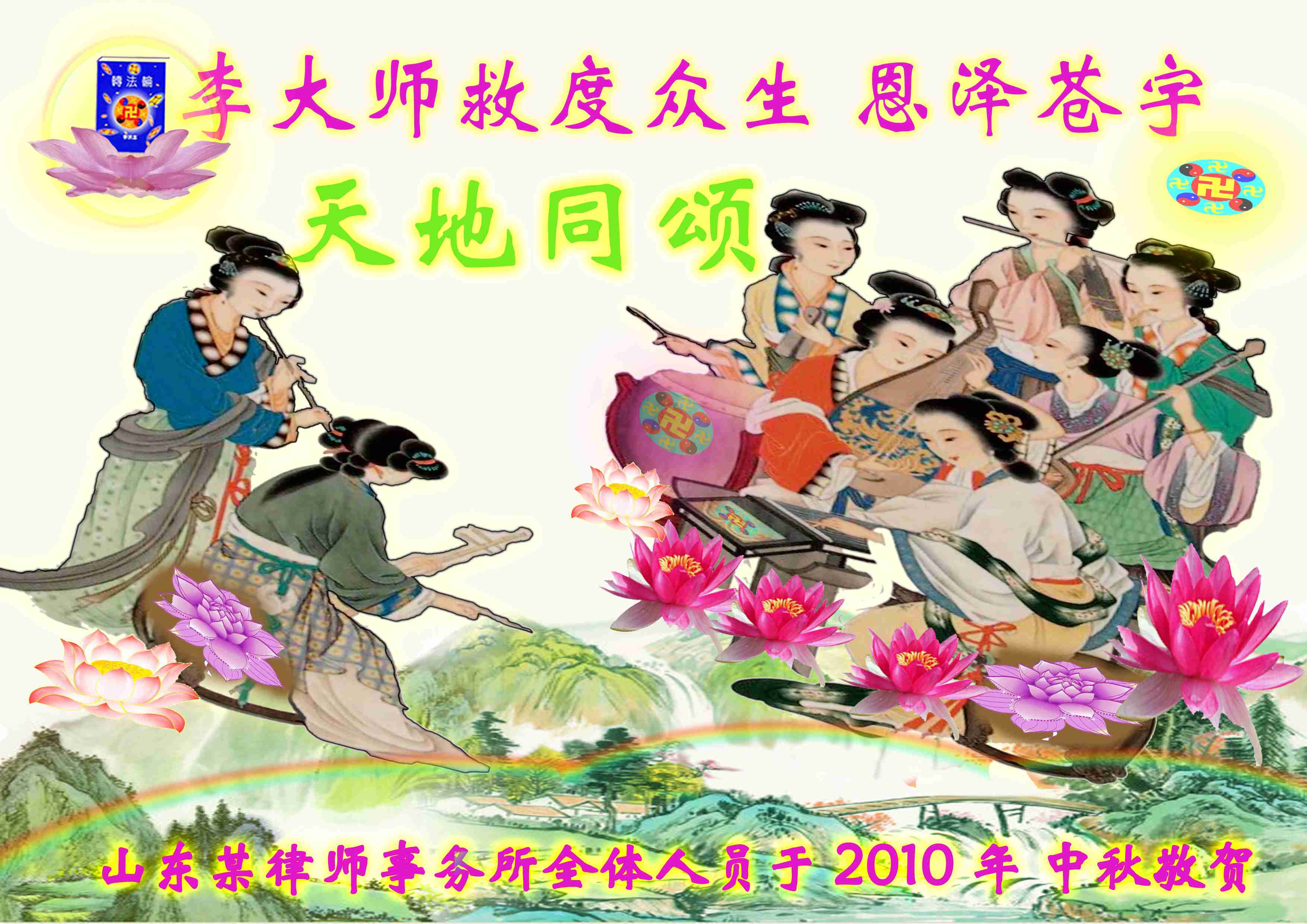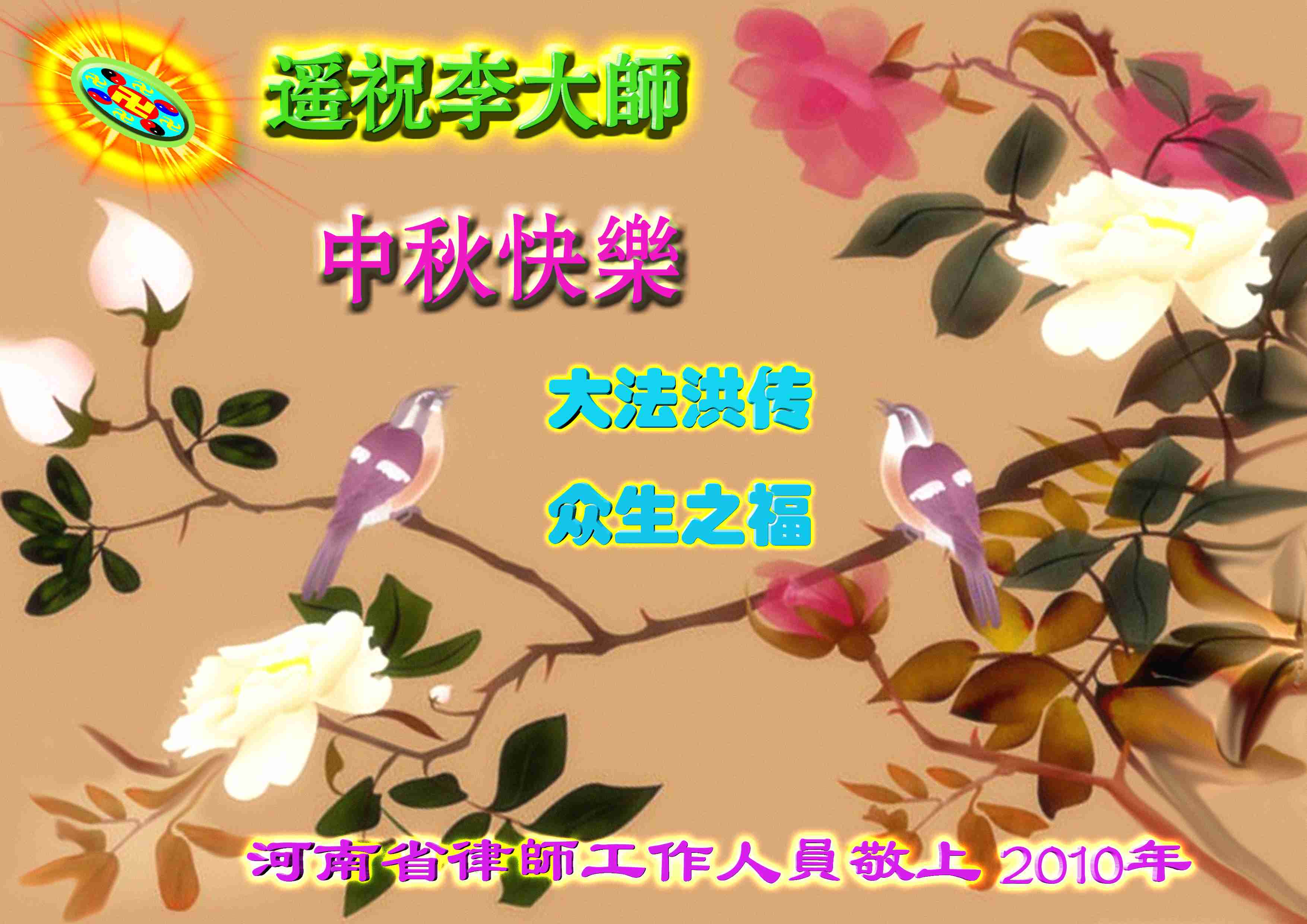 【明慧网二零一零年九月二十二日】河南省律师工作人员恭祝李大师中秋快乐!谢谢李大师的救度之恩!请李大师放心,乌云是遮不住太阳的,邪恶只能逞凶一时,正义终究会战胜邪恶的!我们敬等李大师归来! 甘肃舟曲一得救生命祝李师父中秋节快乐!