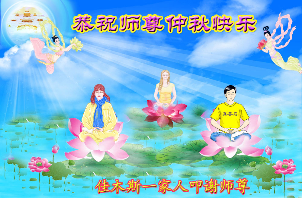 大法弟子想念您。 佳木斯一家人五名大法弟子、八名明白真相的常人向慈悲伟大的师尊问好!恭祝师尊中秋快乐!