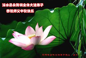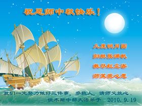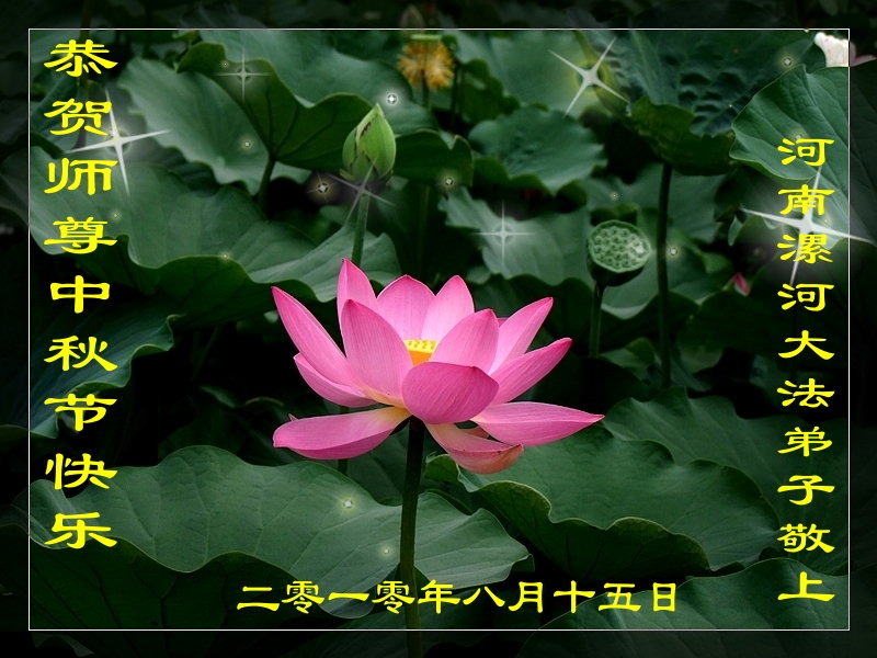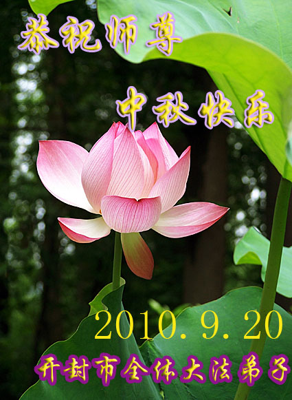 在中国传统的节日(八月十五)到来之即,郑州大法弟子向伟大的师尊问好! 在十多年风风雨雨中,在证实大法救度世人的路上,我们感觉尽到了最大的努力做好三件事,但与师父的要求,与大法的标准还有不小的差距,特别是学了师父最近的新经文《再精進》,对我们有很大的促進,我们学法小组的全体同修表示:我们坚持运用好向内找这个法宝,坚信师父,坚信大法,修好自己,多救众生,完成我们来时的史前大愿,圆满把家还,让师父放心。 河南郑州大法弟子(学法小组) 二零一零年九月二十日 河南周口市扶沟县大法弟子恭祝师尊中秋快乐!