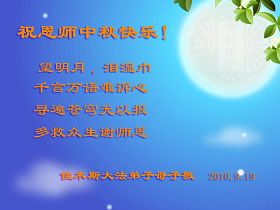 【明慧网二零一零年九月二十二日】 沈阳一家庭资料点大法弟子祝师尊中秋快乐!
