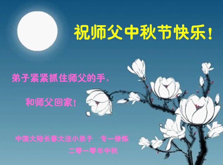长春大法小弟子祝师父中秋节快乐!弟子一定紧紧抓住师父的手,和师父回家! 扎兰屯市大法弟子恭祝师尊中秋快乐! 牙克石市大法弟子恭祝师尊中秋快乐!
