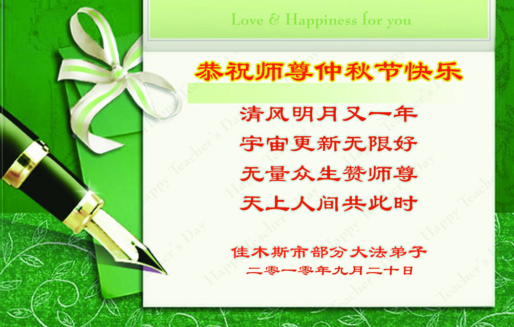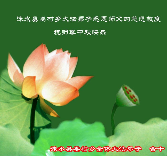 在中秋节来临之际,我们保定全体大法弟子恭祝师尊中秋节快乐! 在助师正法最后的最后,我们一定放下自我,互相包容,互相配合,圆容整体,做好三件事,救度更多的众生, 兑现自己的誓约和承诺,在修炼的路上更加勇猛精進,让师尊多一份欣慰,少一份操劳! 保定全体大法弟子跪拜合十 二零一零年九月十九日 在中秋节来临之际,我们保定全体大法弟子恭祝师尊中秋节快乐! 在助师正法最后的最后,我们一定放下自我,互相包容,互相配合,圆容整体,做好三件事,救度更多的众生, 兑现自己的誓约和承诺,在修炼的路上更加勇猛精進,让师尊多一份欣慰,少一份操劳! 保定全体大法弟子跪拜合十 二零一零年九月十九日 河北省泊头市全体大法弟子恭祝师尊中秋快乐!