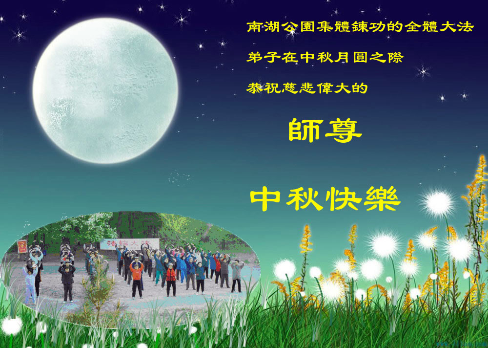 南湖公园集体炼功的全体大法弟子恭祝慈悲伟大的师尊中秋快乐!