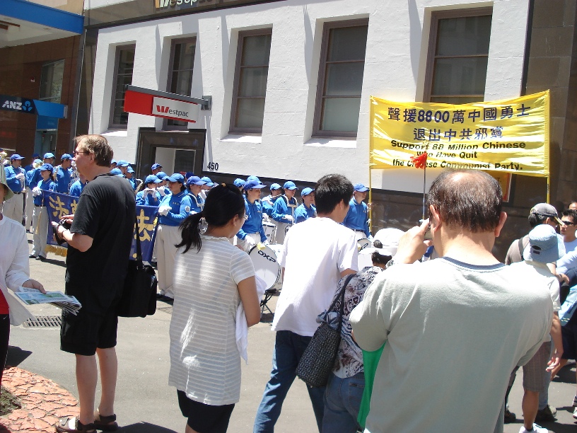 街道两旁“天灭中共、退!党!保命”、“声援八千八百万勇士退出中共邪*党-”、 “只有解体中共才能制止迫害”等巨大横幅,格外醒目。悉尼天国乐团演奏的“法轮大法好”吸引了许多群众驻足观看、拍照,其中有不少中国大陆人士了解真相、声明三:退.。