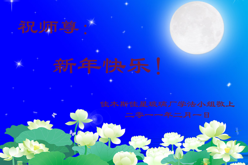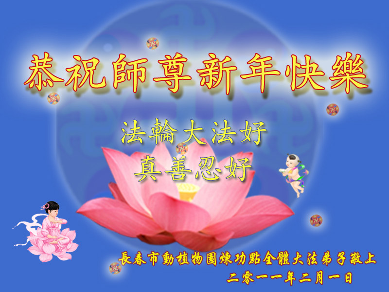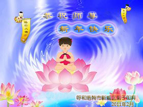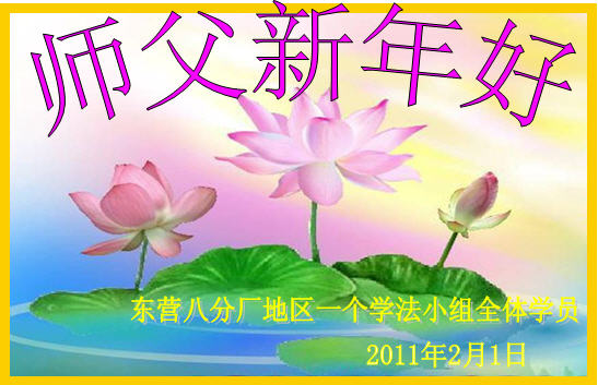 兔生瑞气绣三春, 大法慈悲度众生; 问声师父新年好! 遥拜跪叩谢师恩。 弟子救人了洪愿, 时刻不忘修自身; 前路坎坷无须惧, 凝定心志随师行。 河南信阳一学法小组全体大法学员敬拜 二零一一年一月三十一日 黑龙江省大庆市乙烯地区全体大法弟子恭祝伟大的师尊新年快乐!