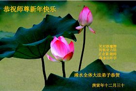 在此新年之际,我们感谢师尊的慈悲苦度。在新的一年,我们要认真做好“三件事”,救度更多众生。 大陆一大法弟子祝师尊新年快乐!