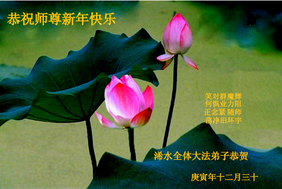 是师尊把我们从黑暗引向光明,从久远的年代开始…… 久远的誓约在耳边响起…… 随师正法,救度众生是我们的使命! 跟上正法進程才配“正法时期大法弟子”伟大的称号 师父啊,请放心 万朵净莲争香艳 莲香四射了誓愿 恭祝师尊新年好 新的一年笑开颜! 祈盼神韵回归大陆演 盼望师尊早日返家园! 江苏省盐城市大法弟子恭祝师尊新年快乐!