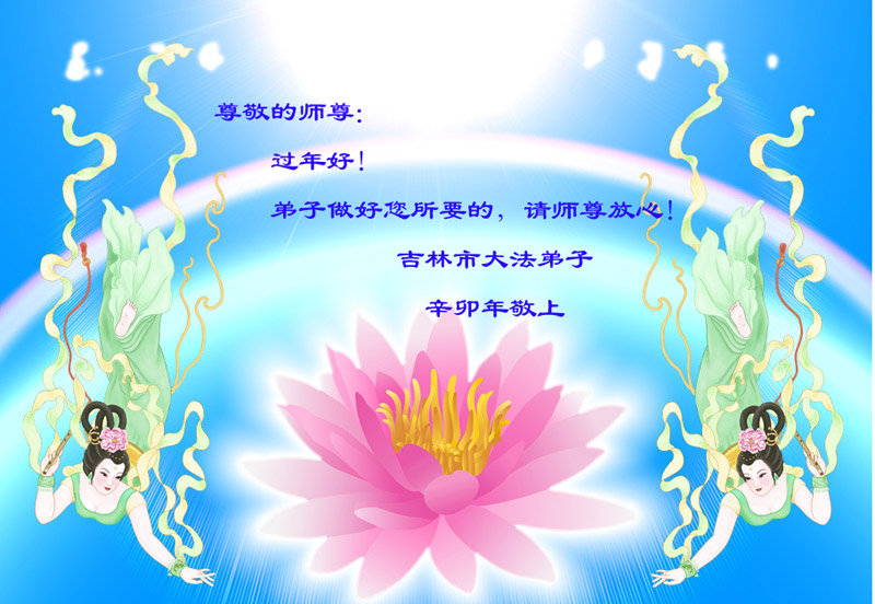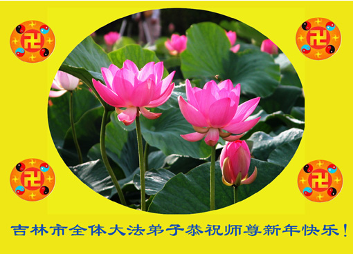 每逢佳节倍思亲,在这新年来临之际,我们大法弟子无比想念身在大洋彼岸的师尊。我们向慈悲伟大的师尊致以最崇高的敬意和无限的感恩之心!我们能从中共邪*党-迫害的腥风血雨的魔难之中走到今天,就是因为师尊每时每刻都在慈悲的呵护着我们;就是因为师尊每时每刻都在我们的身边,谆谆叮嘱我们,使我们明白方向,知道怎样做好。师恩浩荡,无以回报。千言万语也难以表达弟子的心情。只有听师尊的话,在今后的修炼中,多学法,学好法,修好自己,做好三件事。珍惜抓紧这最后的时间抢救更多的众生。正念正行,助师正法,不负师恩,不负众生期盼。让师尊少操一点心,多一点欣慰。听师尊的话,圆容好师尊所要的,兑现我们的史前大愿,做一个合格的正法时期的大法弟子。请师尊放心吧,弟子一定会做好的。 吉林市大法弟子恭祝师尊新年快乐!