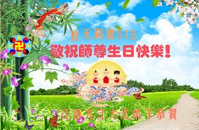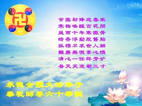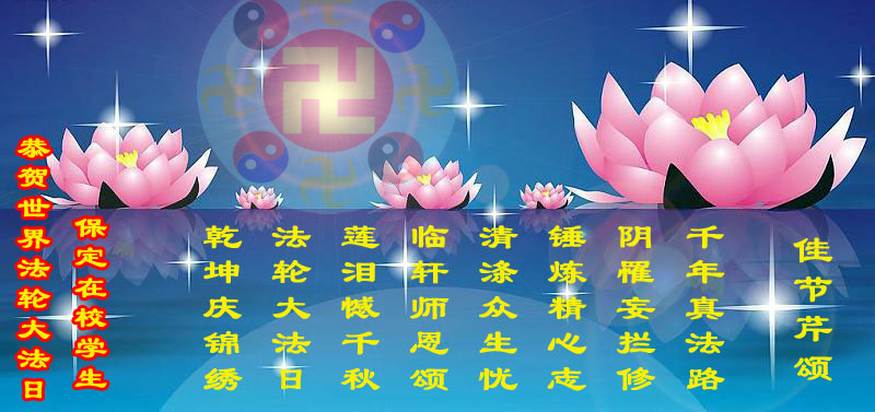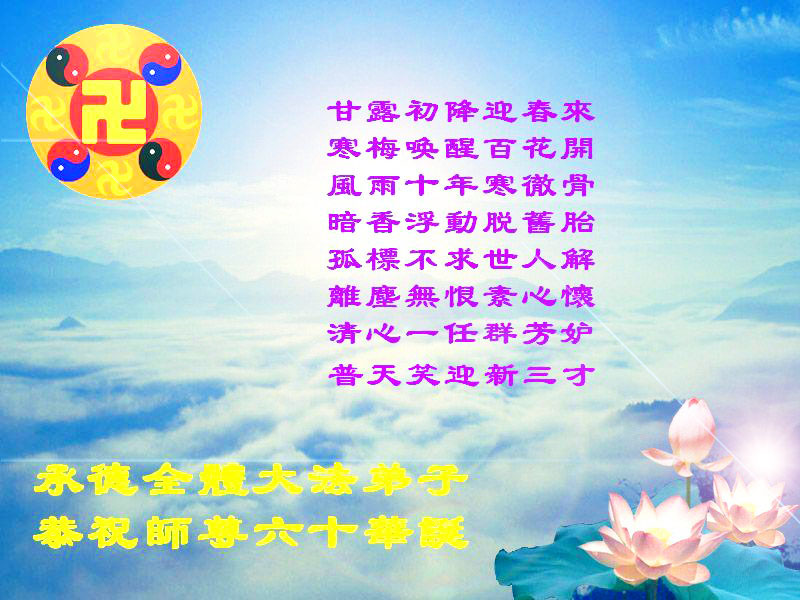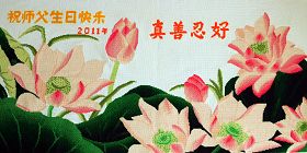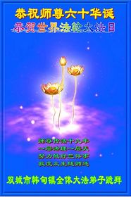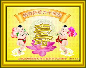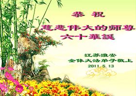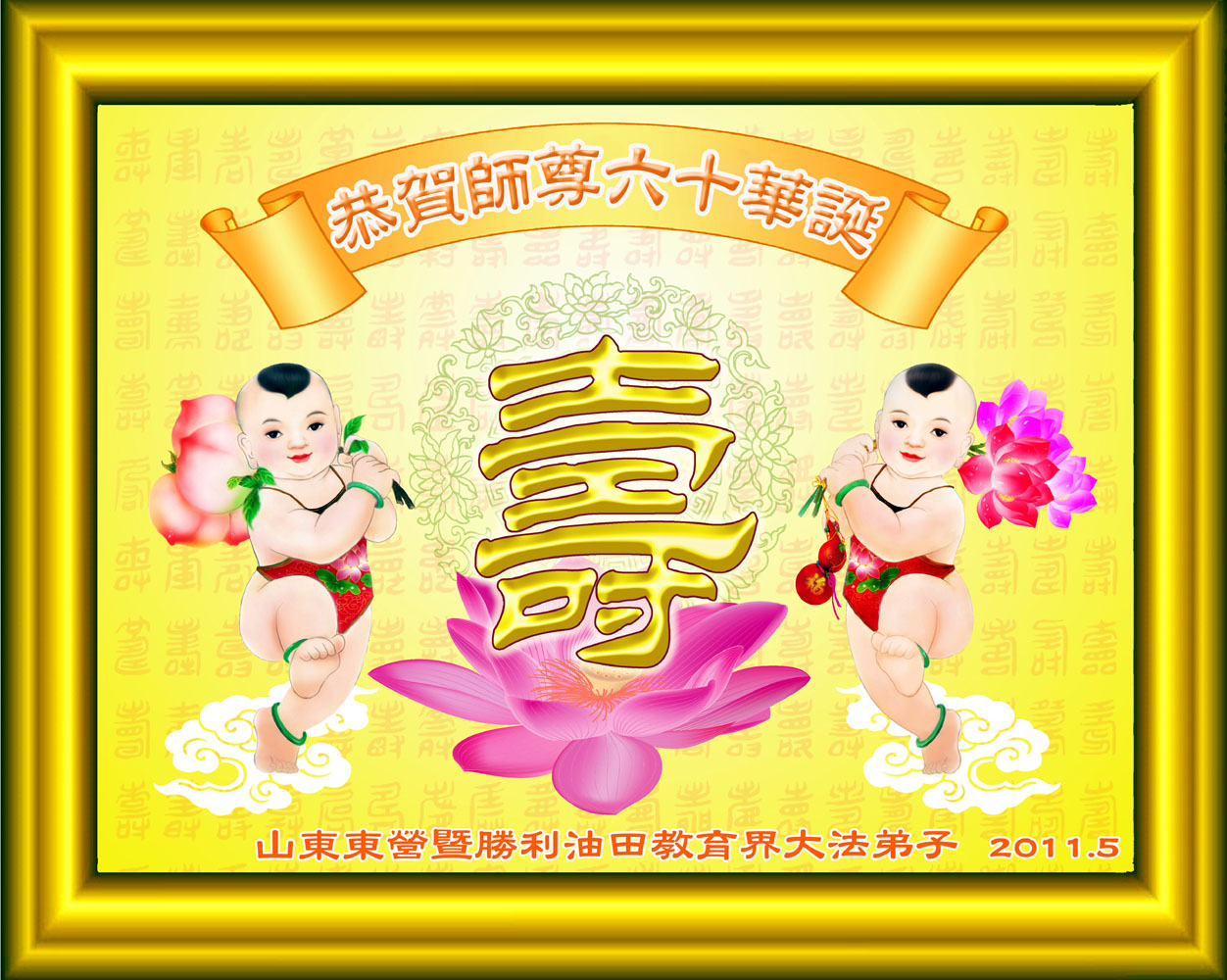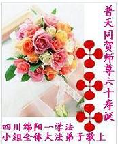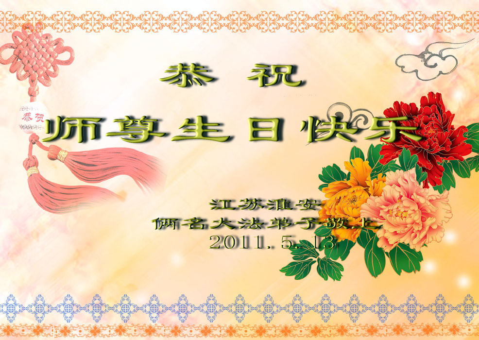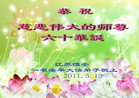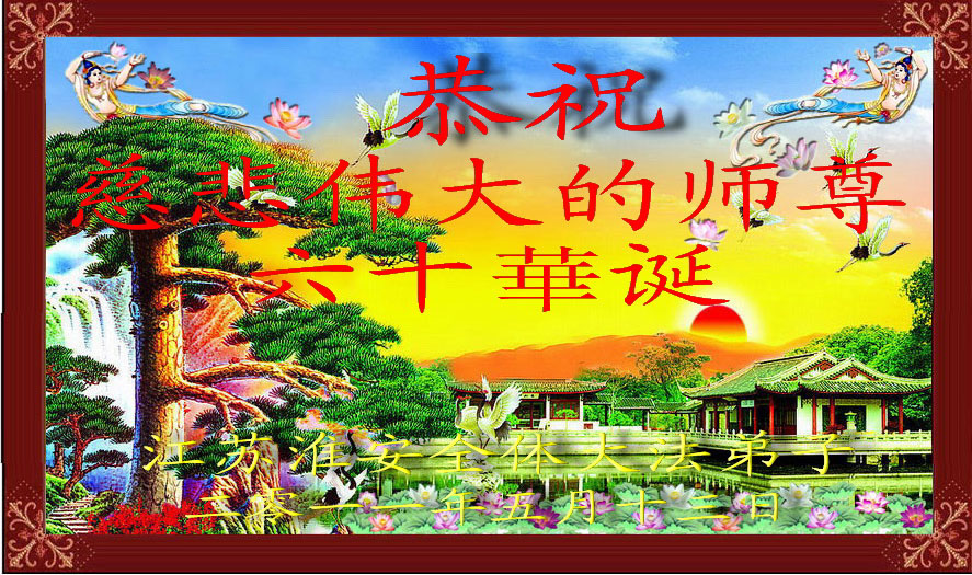 吉林省抚松县全体大法弟子恭祝师尊生日快乐!山东东营胜利油田教育界大法弟子恭祝师尊六十华诞!甘肃兰州大法弟子创作刺绣:普天同庆——祝师尊六十华诞!甘肃兰州大法弟子的美术作品“莲”——祝师尊六十华诞!武汉市江汉区大法弟子恭贺师尊六十华诞!天津宁河大法弟子祝福慈悲伟大的师尊生日快乐!江苏省淮安市全体大法弟子恭祝师尊生日快乐!广东省揭东县全体大法弟子恭祝师尊生日快乐!山东诸城全体大法弟子恭祝慈悲伟大的师尊生日快乐!攀枝花全体大法弟子恭祝慈悲伟大的师尊生日快乐!恭祝师尊六十华诞!庆祝世界法轮大法日!天津宁河全体大法弟子恭祝师尊生日快乐!广东省揭阳全体大法弟子恭祝师尊生日快乐!辽阳大法弟子祝师父生日快乐!承德全体大法弟子恭贺师尊华诞!恭祝慈悲伟大的师尊生日快乐!成都理工大一学法小组大法弟子恭祝慈悲伟大的师尊生日快乐! 恭候伟大的师尊生日快乐!弟子愿师尊少一份操劳,多一份欣慰。 大陆一学法小组全体大法弟子 喜迎慈悲伟大的师尊六十华诞,江苏淮安弟子恭祝师尊生日快乐!