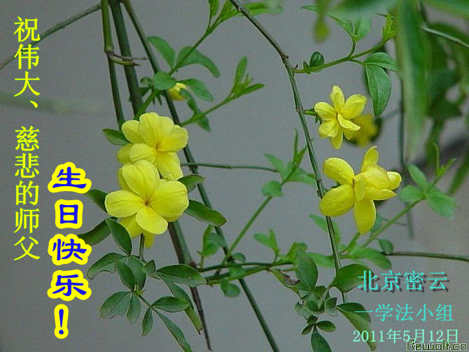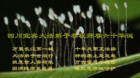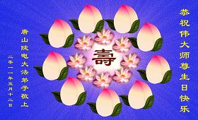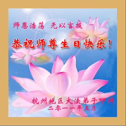 【明慧网二零一一年五月十四日】5月13日是法轮功创始人李洪志师父的华诞,也是世界法轮大法日。自1992年5月13日,李洪志师父在长春将法轮大法向世人传出,修者身心受益,修炼人数日益增多。中共对法轮功长达十几年的迫害,不但没有使修炼人放弃信仰,大法弟子更加坚定了修炼的路。值此师父六十华诞之际,世界各地的法轮大法弟子,都向明慧网寄来贺卡贺词,恭贺师尊华诞,并庆祝“世界法轮大法日”。中国大陆各地的大法弟子们突破中共的网络封锁,也发来他们的贺信,表达他们对师父的感恩和对修炼的坚定。这里是明慧编辑部已整理出来的大陆地区(264地)来信汇编:山东省淄博市张店区一个明真相的常人贺大师六十华诞《感悟》 真信大法不动摇, 善心慈悲待人好, 忍字牢记境界高, 好人一生得福报。 贺大师六十华诞 山东省淄博市张店区一个明真相的常人 辛卯年四月 盼师尊笑还记得九岁起,我跪在佛像前对着将被拆走的佛像流着泪说:我永远是您的弟子。敬爱的师尊您听到了我的声音,从那时起保佑着一身病业,而且由于家庭带来的精神十分痛苦的我。十二岁时我发誓十八岁生日那天走上五台出家,敬爱的师尊您在我十五岁时就让我得到了一眼看见就一口气读完的《转法轮》结束了我从佛教道教到基督教的寻找,我等到了我真正的缘,找到了我最后的归宿,我不再每晚失眠三小时,不再满脸是疮,不再浑身是病,不再精神抑郁,不再喜欢黑色。 黑色的十八岁,中共邪教从小给我灌输的党文化虽然让我不懂得它为什么要迫害大法,但那最黑色的一天,我对别的同修说:如果师父说的是假的,那这个世界上一切都是假的。即使谁都不信了,剩我一个人我也相信。从此我开始了没有开心没有笑容,只有百口莫辩的岁月和日子。 人生的第一次真实的十九岁,我走上了天安门,我去了那里想到的只有一件事,师父是清白的,真的是清白的,因为师父让我做好人,做一个身心健康的好人,我应该让人听到我的心声。 第一次看到师父那慈祥的面容,我就觉得面熟,我就觉得我是认识师父的,看了师父的小传知道了师父从小一看到可怜的人和可怜的电视故事就会哭,我也是这样,我看到杀鱼,心中好难过,怕人笑,一个人躲在墙角哭,听到或看到可怜的事,更是哽咽的无法控制。所以,是师父善良慈祥的眼神,让我感到了似曾相识,也让我在什么都不懂什么都不明白的情况下,用心感受到了师尊承受的莫大冤屈。 在天安门广场,我从小没有想到过被塑造成最可爱的人的公安是那个样子的,我终身难忘他们在光天化日之下众目睽睽之中的调戏,在我制止他们侮辱老人时他们的殴打,他们的欺骗,他们和流氓一样的举止。 时至今日,随着真相的一步步展现,善恶的界限在世人的心中终于有了清晰的划分。全世界都知道了谁是真正的邪教,谁是真正的世界末日的缔造者。 敬爱的师尊仍在为不明真相的世人担忧,不见师尊开怀,不见师尊的笑,弟子等无法用世间的语言描述师尊的慈悲,只能尽好一己之力,让世人明白,让世人真正的明白一切,并真正的按照师父的法,回归人之至善,至真,至忍。 恭贺师尊六十华诞,盼天下人早明是非真相,让师尊早日开怀,早日笑! 广东珠海全体大法弟子恭祝师尊华诞,祝师父生日快乐!正法必成!珠海全体大法弟子将共同走好最后的路,完成助师正法、救度众生的史前洪愿,跟随师尊回家! 湖南邵东在外打工的大法弟子恭祝师父生日快乐山东省淄博市淄川区全体大法弟子恭祝师尊生日快乐!山东潍坊大法弟子恭祝慈悲伟大的师尊生日快乐!欢庆“世界法轮大法日”!河北省衡水市全体大法弟子恭祝伟大的师尊生日快乐!师尊请您放心,我们一定不辜负您的救度之恩!我们一定从法上精進,助师正法,救度众生,圆满随师还! 衡水全体大法弟子敬上 2011-5-12 青海省格尔木市全体大法弟子跪拜师尊!恭祝慈悲伟大的师尊六十华诞!普天同庆世界法轮大法日!恭祝法轮大法洪传十九周年! 青海省格尔木市全体大法弟子敬上! 湖南湘潭湘乡市全体大法弟子恭祝师父生日快乐,庆祝世界法轮大法日慈悲伟大的师父:您好! 湘乡市全体大法弟子恭祝师父生日快乐,庆祝世界法轮大法日。 此致敬礼 湘乡市全体大法弟子合十 2011年5月13日 浙江温州大法弟子在此恭祝师尊生日快乐!辽宁一学法小组大法弟子祝师尊生日快乐!敬祝伟大的师尊生日快乐!大法洪传十九年,我们越来越能感觉到溶于法中的快乐与幸福。谢谢师父的慈悲救度,在正法的最后时刻不懈怠,精進实修,救度众生,做好大法弟子应该做的! 辽宁一学法小组大法弟子 2011、5、12 北京顺义大法弟子恭贺师尊华诞!请师尊放心,我们一定做好三件事,完成我们救度众生、助师正法的使命。 山东省栖霞市一大法弟子全家祝贺师父生日快乐,同时祝贺世界法轮大法日!我们沐浴在师尊的佛恩浩荡之中,一定勇猛精進,努力做好“三件事”,救度更多的世人,不负师尊的期望。 山东平度市大法弟子全家恭祝师父六十华诞暨世界法轮大法日,给师父跪拜叩首。吉林桦甸大法弟子在师尊六十华诞来临之际祝师父生日快乐!我们对师父的感恩无以言表,唯有精進再精進做好三件事才稍有心安。在此跪拜叩谢师尊救度之恩:祝师父生日快乐! 山东栖霞观里大法弟子恭祝慈悲伟大师尊生日快乐又一年,弟子恭祝慈悲伟大师尊生日快乐。 栖霞观里大法弟子 威海大法弟子母子