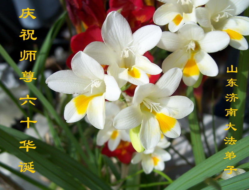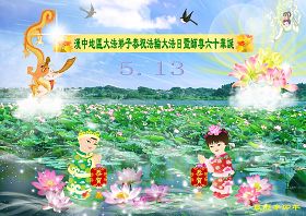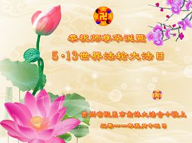 风雨过后花更艳 救度众生不得闲 信师信法不懈怠 正念正行得圆满 又逢一年五一三 弟子愿师笑开颜 郑州大法弟子恭祝师尊六十华诞暨法轮大法洪传全世界十九周年