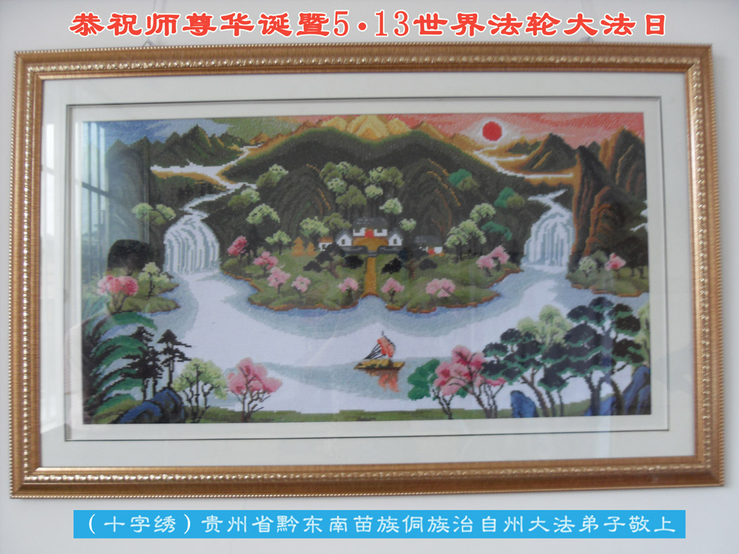 这是贵州省凯里市大法弟子为庆贺师尊华诞暨五一三世界法轮大法日做的十字绣的照片,真实实物更漂亮。代作者问候师尊,同时希望世界大法弟子共同精進,做一个合格的大法弟子。 东莞阳江籍大法弟子一家四口恭祝师尊华诞暨法轮大法日!