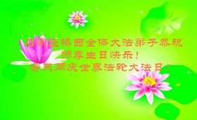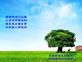 师尊您好!师尊辛苦了!在法轮大法开传十九周年之际,郑州大法弟子共同叩拜师尊!我们一定抓紧有限时间,精進不怠,放下执著,做好三件事,不辱使命,报答师恩! 河北霸州大法弟子恭祝师尊生日快乐!