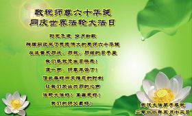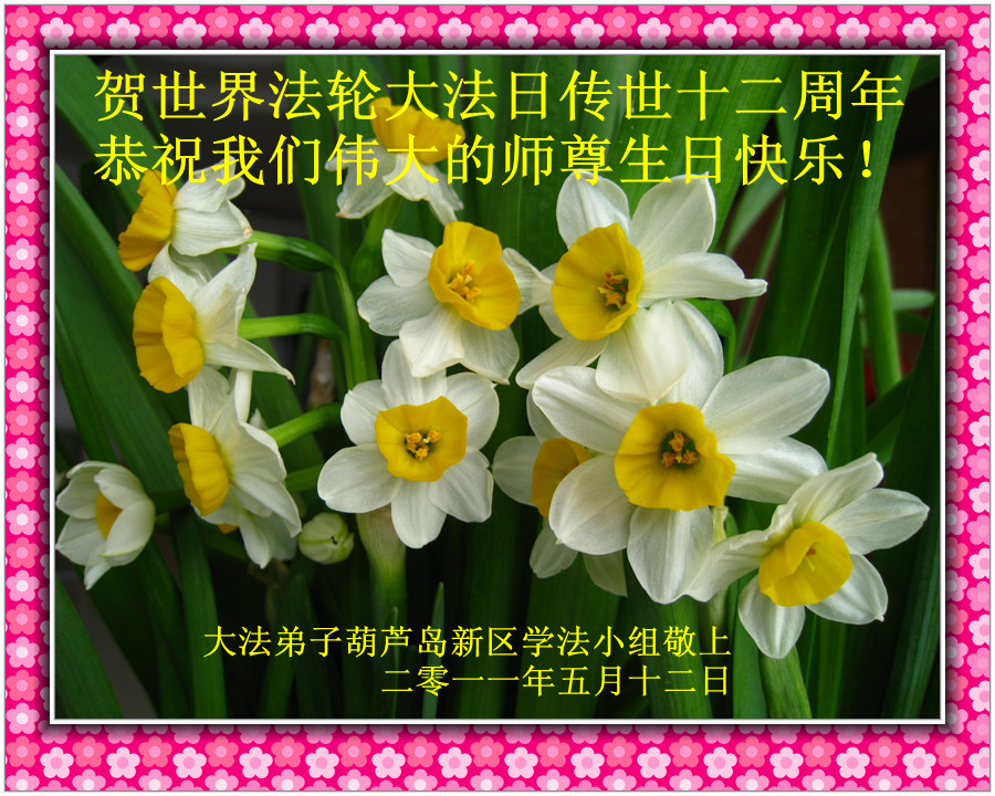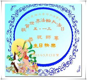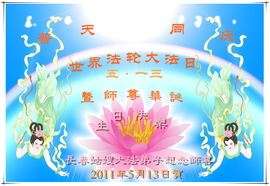 明天就是第12个世界法轮大法日,师尊的六十华诞。我是在师尊的慈悲的看护下跌跌爬爬的走到了今天,无法用语言来表达对师尊的感恩心情,只有在此恭祝师尊生日快乐,走好下面的路,多救众生,圆满随师还。南京大法弟子敬上 二零一一年五月十二日 保定大法弟子恭祝师尊生日快乐