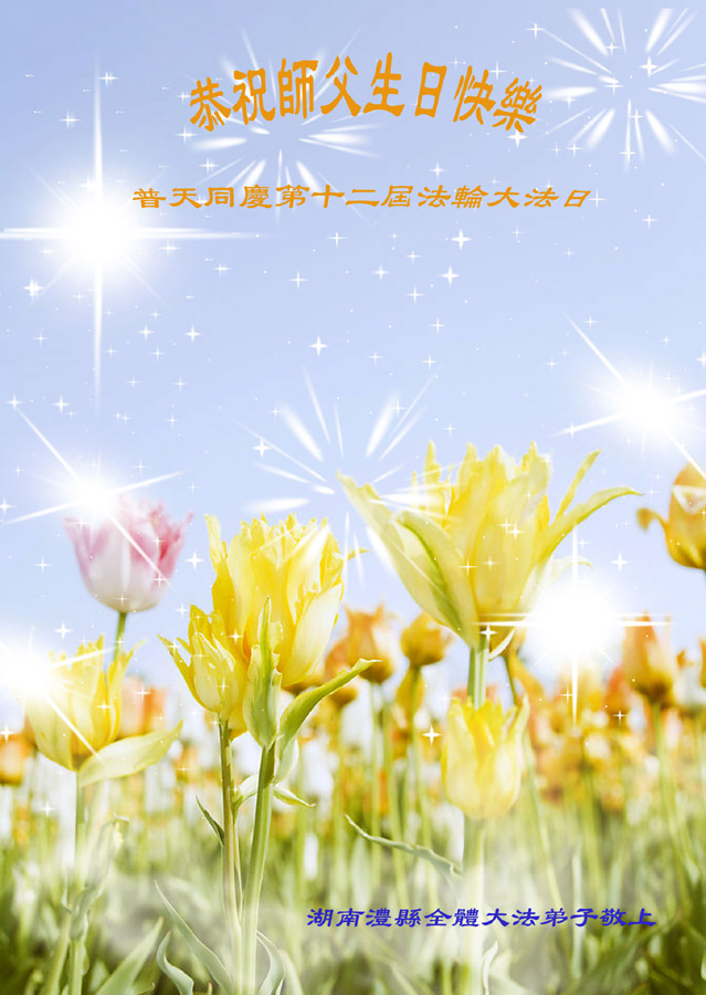 敬爱的师尊:您辛苦了! 我们灵寿县全体大法弟子敬祝您生日快乐! 我们热切盼望着在大陆与您相见,听您给我们讲法! 血雨腥风的红色恐怖快十二年了,我们感觉到师尊时时刻刻在我们身边,呵护着我们,为我们,为宇宙众生操尽了心,吃尽了苦。 尽管我们做的有很多差距,但我们一定尽力做好“三件事”,对得起大法弟子的伟大称号! 河北省灵寿县全体大法弟子给你叩头了! 佳木斯大法弟子姐妹恭祝师父生日快乐