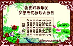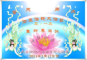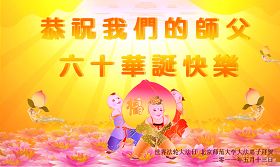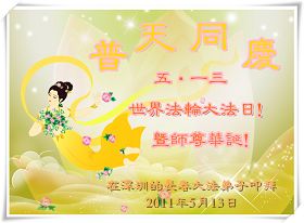 欢庆世界法轮大法日 欢庆法轮大法洪传世界十九周年 感谢师尊对宇宙大穹的再造之恩 感谢师尊对宇宙众生的再造之恩 师尊辛苦了,谢谢师尊,弟子只有做好三件事才能回报师恩之万一。 弟子祝愿师尊一切都好,弟子努力做好三件事,盼望师尊早一天回到中国大陆,和众弟子团圆。 蔚县大法弟子敬上 二零一一年五月十二日 在法轮大法日来临之际,深圳大法弟子祝福师父六十寿辰!
