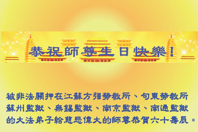被非法关押在江苏方强劳教所、句东劳教所、苏州监狱、无锡监狱、南京监狱、南通监狱的大法弟子向慈悲伟大的师尊恭贺六十寿辰。