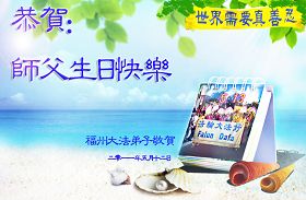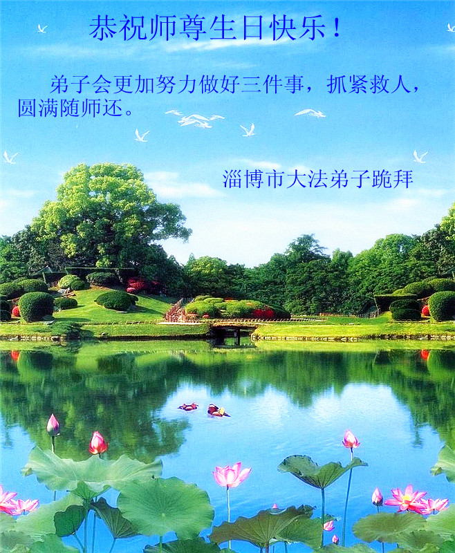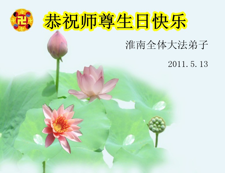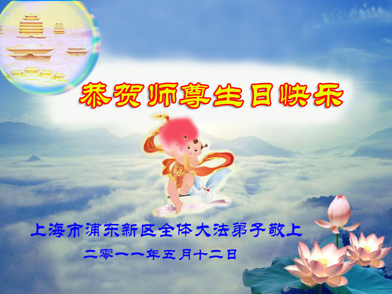 实修中时时感受到师尊的慈悲呵护,我要多学法,多去执著心,多救人,以报答师尊的慈悲救度之恩!祝师父生日快乐!师父辛苦了! 广州一独修大法弟子敬上 2011年5月12日晚 淄博市大法弟子恭祝师尊生日快乐!