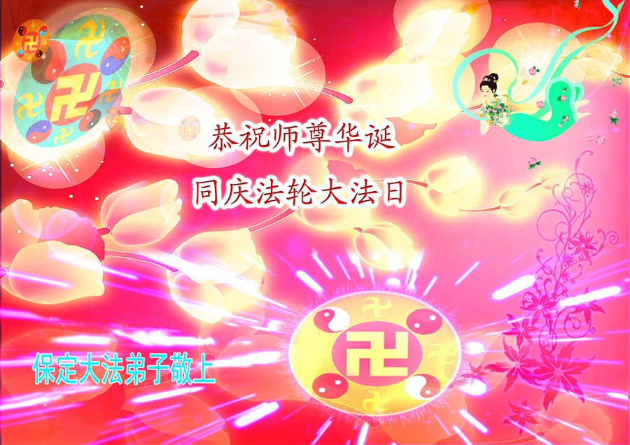 师父您好:师父您辛苦了。我是北京师范大学的大法弟子,十几年的风风雨雨,感谢师父的慈悲呵护走到今天,深深的谢谢师父,祝师父生日快乐。作为一个弟子,对师父最上的供养就是做好三件事,最终的究竟靠的是勇猛精進。请师父放心,弟子能做好,信师信法决不动摇。 吉林市龙潭区缸窑镇全体大法弟子、大法小弟子恭祝师尊生日快乐!同庆法轮大法日!