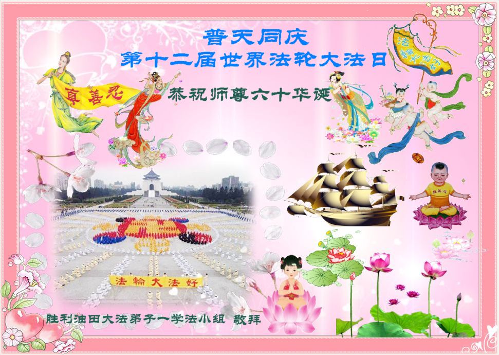 恭贺师尊华诞六十寿辰!恭贺法轮大法日十二周年!我们要整体配合做好三件事,不辜负师尊千年万年的苦度,圆满随师把家还。 天津市南开区大法弟子 2011年5月12日 胜利油田大法弟子一学法小组恭祝师尊六十华诞