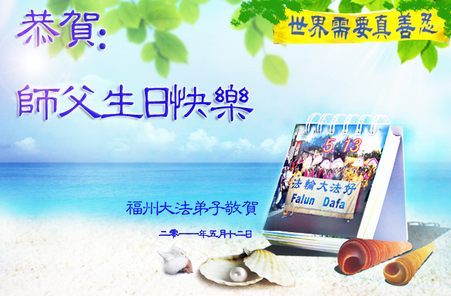 伟大慈悲的师尊:祝你生日快乐! 在这特殊的日子,我们学法小组内心觉的无法用语言表达对您的感恩。 在师父的呵护下,走到现在,深感愧疚。我们做的不够。但今后一定做好您嘱咐的“三件事”。学好法,正念正行,不负师父和众生的厚望。胜利油田大法弟子一学法小组敬拜 二零一一年五月十二日 福州大法弟子恭贺师父生日快乐!