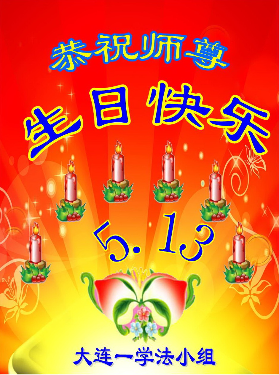 大穹新宇法光耀; 乾坤万物祥瑞兆! 普天同庆五一三, 恭贺师尊华诞到! 法徒跪拜:师父好! 生日快乐慈颜笑! 沐浴主佛亲度恩, 满怀感念无言表。 弟子谨遵三件事: 学法修心向内找。 时时正念灭恶尽, 慈悲救人不辞劳。 兑现洪愿知精進, 整体配合共提高。 待到归船启航日, 无愧仰观师尊笑! 沈阳市两个学法小组六位大法弟子敬上 2011年5月12日 南京大法弟子恭祝师尊生日快乐