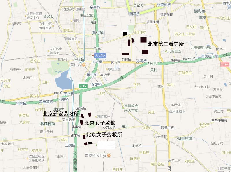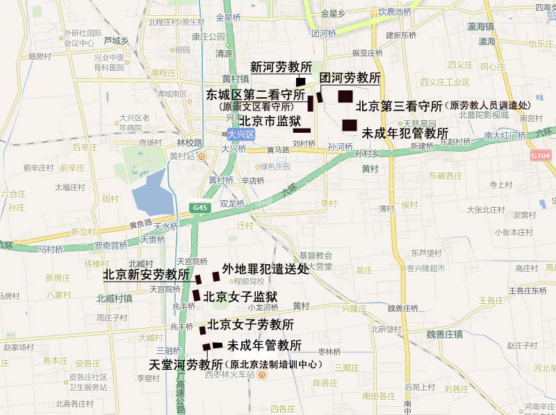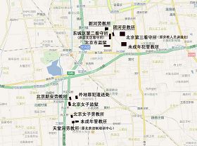 从团河集训队建筑的变化可以看出邪恶的迫害恶行是多么见不得人,多么惧怕曝光于天下。团河劳教所已于二零一零年六月已停止对法轮功学员的迫害,学员转至新安劳教所。 北京劳教人员调遣处被称为人间地狱,是迫害法轮功学员的场所中最邪恶卑鄙的地方。几乎所有北京的劳教人员在这里都领教了“春风化雨”谎言下的“疾风暴雨”。下图所示:二零零一年调遣处由破旧拥挤的平房搬(绿色区域所示)搬迁到豪华的新楼(蓝色区域所示): 随着迫害恶行的大量曝光,北京劳教人员调遣处从二零零九年已无法继续维持迫害,门口换上了北京第三看守所的招牌。 下面是原北京劳教人员调遣处、现在的北京第三看守所影像图: 至此 “法培”(北京法制培训中心简称)和调遣处这两个劳教系统中最邪恶的地方彻底解体。 北京大兴团河和天堂河两大农场迫害法轮功场所明显减少,北京团河农场几乎已经退出对法轮功的迫害。请看现在迫害场所在北京大兴两大农场中的分布图(图上标示名称的是仍在参与迫害的场所): 对比前面那张迫害场所名称密密麻麻的分布图,现在这张图上少了很多,只剩下了四个迫害场所。 北京劳教系统有块“飞地”,就是位于黑龙江省齐齐哈尔市甘南县的北京双河农场、北京双河劳教所。请注意不是齐齐哈尔市的双合劳教所,明慧网上曝光的双河劳教所应为当地的齐齐哈尔市双合劳教所。 下面我们再来看看北京的监狱系统对法轮功的迫害情况。 当年北京监狱管理局各监管场所几乎都参与了对法轮功学员的迫害,而现在仅有北京女子监狱和位于“飞地”清河农场的前进监狱在维持迫害。 这是位于天津宁河县的飞地农场——北京清河农场: 清河农场(粉棕色区域)的迫害场所分布:下图中有六个方块,每个棕色方块表示一个监狱,图中深棕色的方块就是前进监狱所在地。二零零一年底至二零零二年初,中共把原来分散在北京市各监狱和茶淀其它监狱的男性法轮功学员全部转移到这里集中关押迫害。  清河农场迫害场所分布图 |