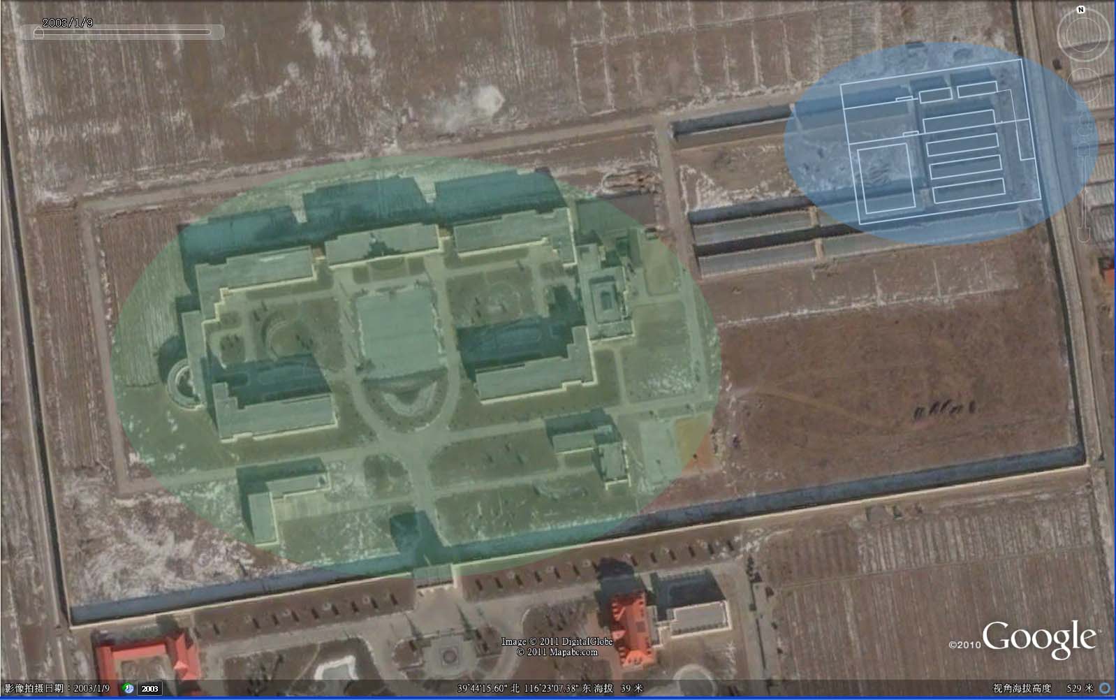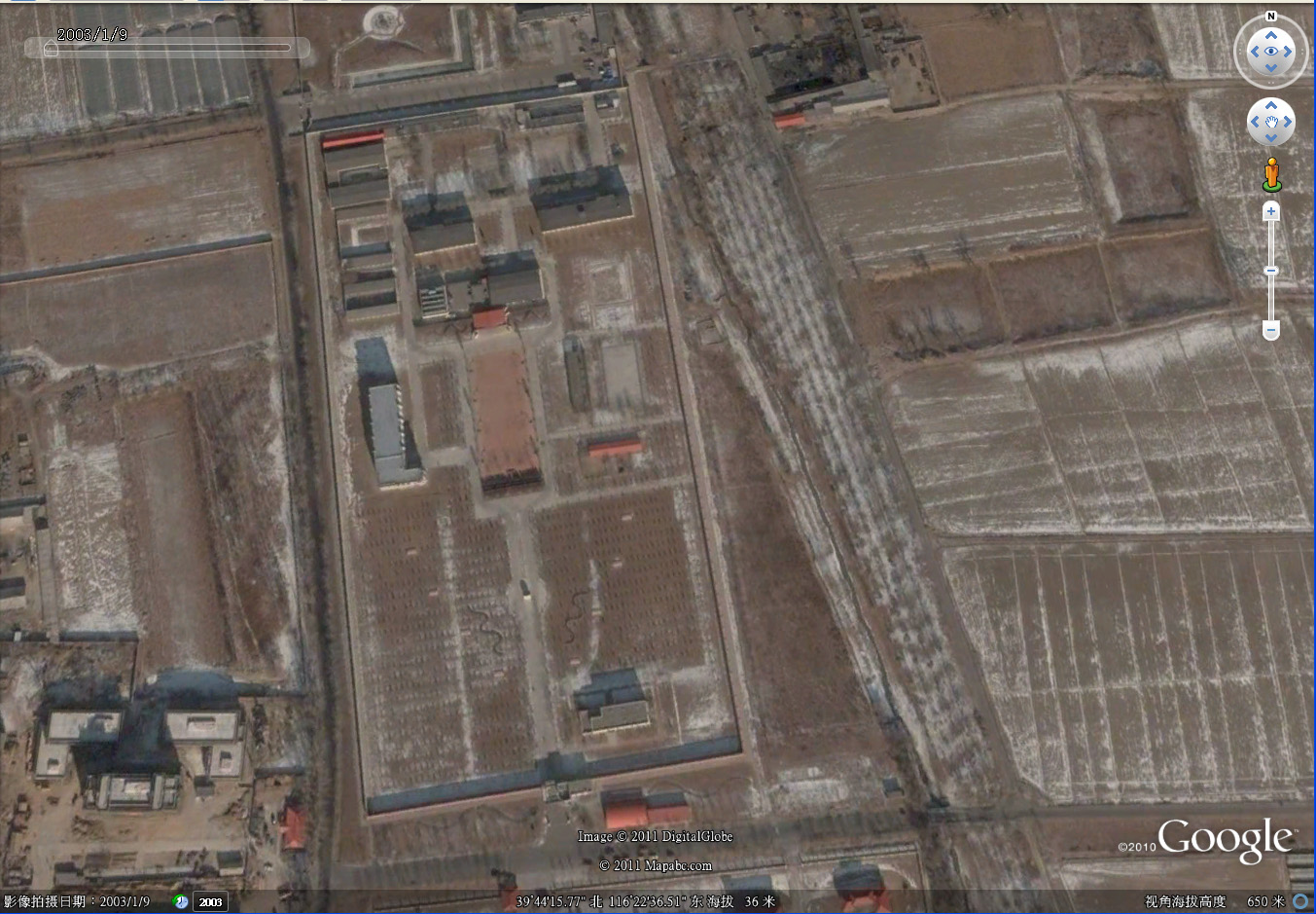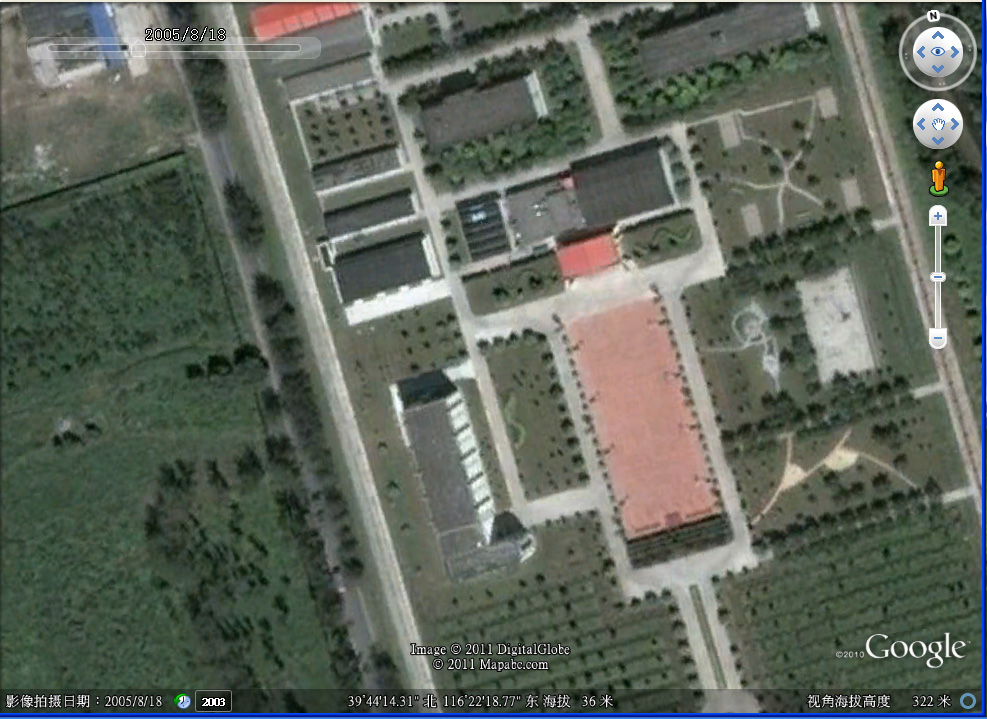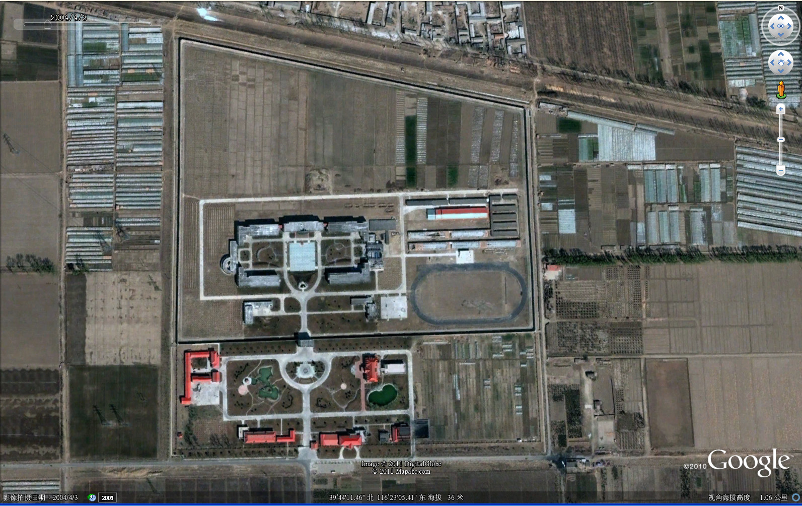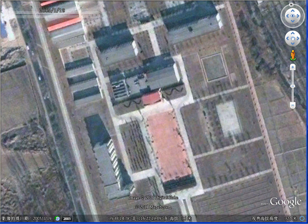 北京团河劳教所是集中关押迫害男性法轮功学员的地方,这里发生过太多惨无人道、性质恶劣的迫害。 下面是二零零三年团河劳教所影像图: 二零零四年法轮功学员彭光俊被团河劳教所集训队迫害致死案在国际上曝光,劳教所系统和中共江泽民集团极度恐慌,迅速撤销集训队。图中左侧三排整齐的平房即是集训队,下面三图表明了集训队房屋的拆除和建设情况,分别是二零零五年一月、四月、八月的影像图:  二零零五年一月,注意左侧三排房整齐的原貌 |