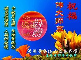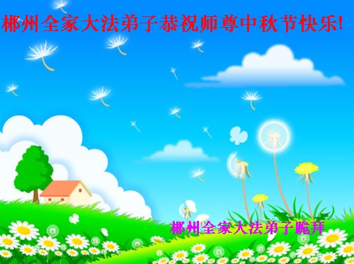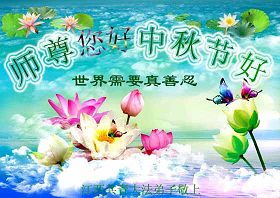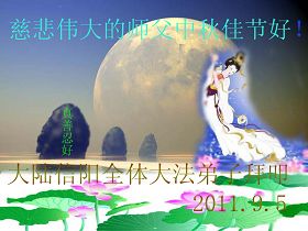 河南周口一全家大法弟子恭祝师尊中秋快乐!河南灵宝大法弟子恭祝师尊中秋节快乐! 弟子身在大法中,沐浴在师尊的佛光里,心中的幸福难以言表!弟子的一切都与大法紧紧的联在了一起,弟子失去人间的任何东西都不可怕,失去大法才是最可怕的!只要心中有法,弟子别无所求了,因为只有大法才是一个生命得以存在的保障,弟子一定珍惜现在拥有的,尽一切力量做好三件事,多救众生,不负师尊的慈悲救度!湖北武汉市东西湖大法弟子恭祝师尊中秋快乐!江西德安全体大法弟子向伟大师父问好!江西德安全体大法弟子值2011中秋佳节即将到来之际,向伟大师父问好! 弟子们定会做好三件大事, 不负师父苦度! 湖南新田全体大法弟子恭祝师尊中秋快乐!武汉市新园全体大法弟子祝中秋节问候师尊!“每逢佳节倍思亲”,在这中秋月圆之际,我们格外想念师尊,并强烈盼望早日与师尊在大陆团圆,恭祝师尊节日快乐! 目前,我们正处在正法时期的最后阶段,无论形势怎么变化,我们一定要百分之百的信师信法;一定要认真做好师父要求的三件事;尤其要专注入心地学好法,在日常工作和生活中一思一念、一言一行都要溶入法中。只有这样,才不辜负师父对大法弟子的鼓励和殷切期望,才对得起师父的慈悲苦度,才能使自己稳定的走好最后的路。 此致敬拜合十,再次问候师尊,祝中秋快乐! 武汉市新园全体大法弟子 2011年8月23日 湖南湘潭大法弟子及亲属叩拜师尊!祝师尊中秋节快乐!我们想念您!跟随您到永远!永远! 郑州大法弟子恭祝师尊中秋快乐!湖南湘潭大法弟子家庭学法小组全体学员祝师父中秋节快乐!我们日日夜夜想念您! 湖南衡阳市大法弟子中秋节谢恩师!中秋节谢恩师:首先让我们以自己最纯净的心恭祝恩师中秋节快乐!恩师告诉了我们破除了一切障碍自己得法的因素,清理了我们返本归真路途中的关键性的障碍,无私地给我们下上了自动旋转的法轮和许许多多修炼的机制,启悟了我们的良知善根,使我们明白了许许多多以前不明白的东西,如人生目地是为何?人为什么不能抗拒疾病和衰老?人为什么要做一个好人,而不能做坏事?一个好好的人为什么会突遭恶运?还有世界发生的很多事之目地是什么?激发了我们同化真善忍的智慧和潜能,从而使我们能自觉地洗净社会对自身的污染,看到了,真正意识到了,我们原来的路上避免的那些应该发生的灾难,恩师太伟大了,恩师的伟大我们真的无法用语言来言表! 湖南衡阳市大法弟子恭贺 湖南郴州全体大法弟子恭祝师尊中秋节快乐!湖北省荆州市全体大法弟子敬祝慈悲伟大的师尊中秋节快乐!河南虞城县大法弟子祝师父中秋节愉快!每逢佳节倍思亲,我们想念师父!虞城县大法弟子祝师父中秋节愉快! 郴州全家大法弟子恭祝师尊中秋节快乐!湖北襄阳大法弟子叩拜师尊恭祝慈悲伟大的师尊中秋快乐!向慈悲伟大的师尊问好!祝您中秋节快乐! 湖北孝感某集体学法小组全体大法弟子敬祝慈悲伟大的师尊中秋节快乐!一年一度的中秋佳节即将来临,我们与师尊相见的日子也越来越近。感谢师尊的指引、呵护和慈悲苦度,使我们在茫茫人海、滚滚红尘中找到了回家的路!在这最后的日子里,我们决心继续做好三件事,修去名利情,用大法弟子光照寰宇的威德,用多做多救的功勋,用放下一切的纯净,用无私无我的修行,向伟大的师尊敬献一份丰硕的见面礼!师尊您好!我们想念您!离开您的日子太久啦,我们想回家!全体弟子叩首再拜。 二零一一年八月三十日。 河南襄县全体大法弟子恭贺慈悲伟大的师尊中秋节快乐!师父:您好!在正法的最后时刻,我们会更加精進,修好自己,相互配合,整体提高,救度更多的众生,不辜负师尊的期望,完成好自己的史前大愿。 襄县全体大法弟子叩谢师恩! 二零一一年中秋 河南遂平全体大法弟子恭祝慈悲伟大的师尊中秋节快乐!感谢伟大的师尊久远至今的慈悲呵护,感谢伟大慈悲的师尊的慈悲苦度!弟子们从内心深处非常想念师尊,从师尊讲的法理上理解,更深深的理解师尊的伟大与慈悲充满整个苍宇。再次感激师尊的慈悲苦度! 在今后的修炼中,在今后的救度众生中,弟子们听师尊的话,以法为师,多学法,多向内找,修得执著无一漏,做好三件事,坚持到最后与师尊相见!再次祝伟大的师尊中秋节快乐! 河南遂平全体大法弟子 二零一一年八月三十日 湖北钟祥大法弟子祖孙二人恭祝师尊中秋快乐!用人的语言难于表达对师尊感恩,我们一直在师尊的慈悲呵护下度过了一个个险关,弟子唯有做好三件事,认真实修。 河南信阳大法弟子恭祝师尊中秋快乐!湖南衡阳市全体大法弟子恭祝师父中秋节快乐!师父您辛苦了,我们会坚定的做好大法弟子应该做好的三件事,早日兑现史前洪愿,做合格的大法徒,圆满随师还。 衡阳市全体大法弟子叩拜!合十 二零一一年八月三十一日 湖南衡阳大法弟子敬师尊中秋节快乐!师尊您好! 师父为弟子承受太多,师父您辛苦啦!我一定努力做好三件事,随师回家。值中秋之时,敬师尊中秋节快乐! 衡阳大法弟子合十 二零一一年八月三十日 武汉市大法弟子恭祝师尊中秋快乐!
