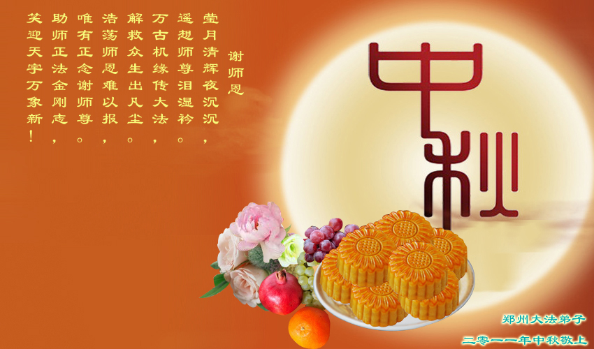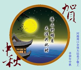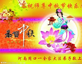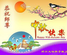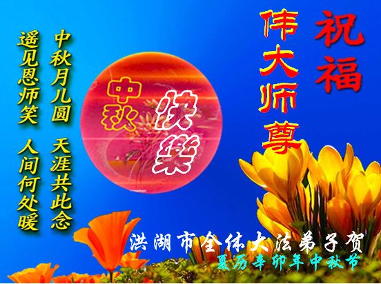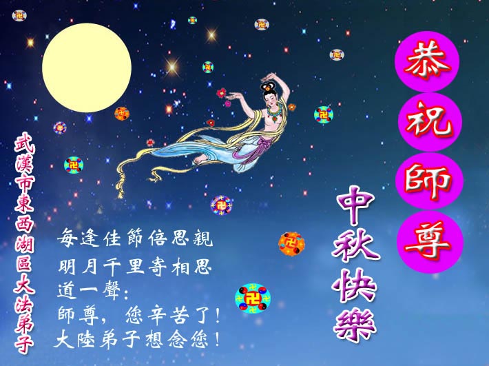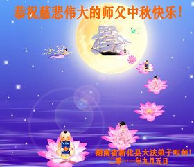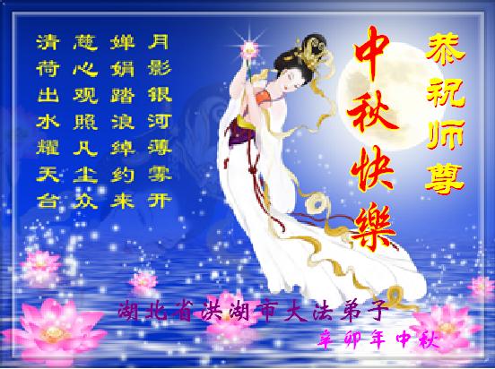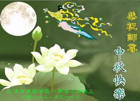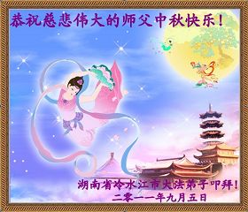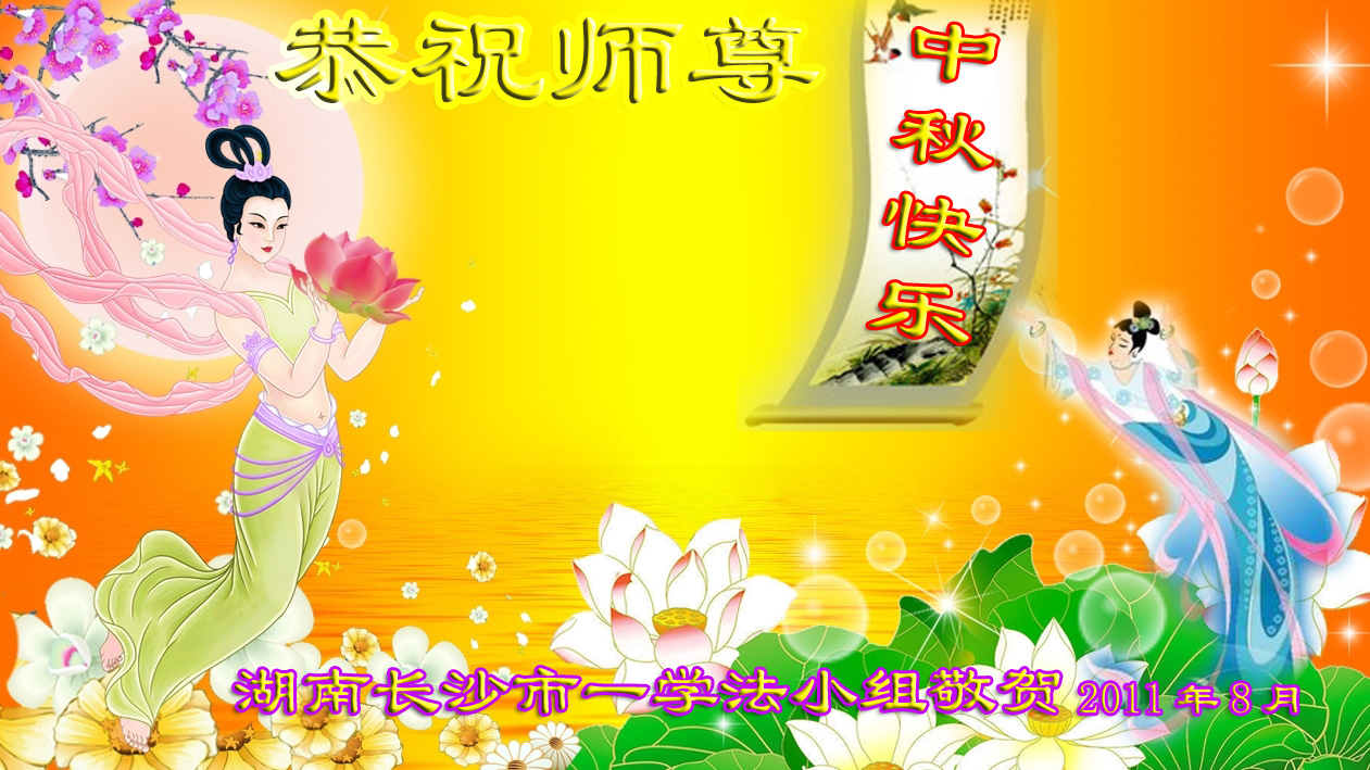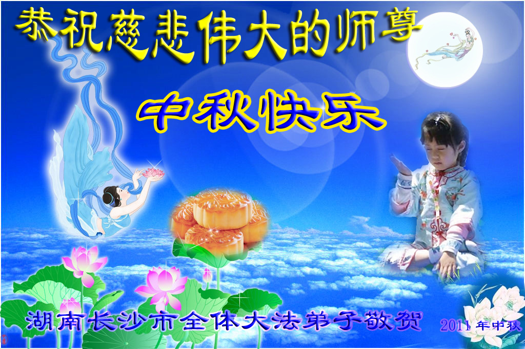 【明慧网二零一一年九月十二日】值此中秋佳节,中国大陆各地大法弟子纷纷寄来贺卡贺词,恭祝慈悲伟大的师尊中秋快乐。以下是来自华中大法弟子的贺卡贺词(共100条)。湖北十堰大法弟子恭祝师尊中秋快乐!湖北省十堰市大法弟子三口之家恭祝师尊中秋快乐!感谢师尊慈悲救众生,正法宇宙!江西共青市大法弟子恭祝师尊中秋节快乐!值2011中秋佳节即将到来,江西共青市大法弟子寄来贺卡,恭祝师尊中秋快乐! 坚定走好以后的路,迎接师尊早日回中国。 河南周口全体大法弟子祝师尊中秋快乐! 师尊您好!祝师尊中秋快乐!武汉东西湖区一学法小组大法弟子恭祝师尊中秋快乐!郑州市全体大法弟子祝师父中秋节好!湖南长沙全体大法弟子恭祝师尊中秋快乐!