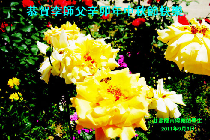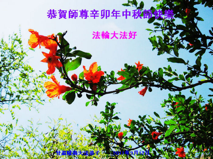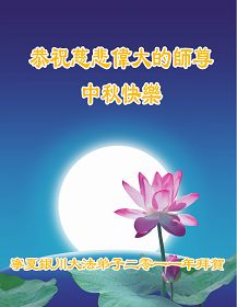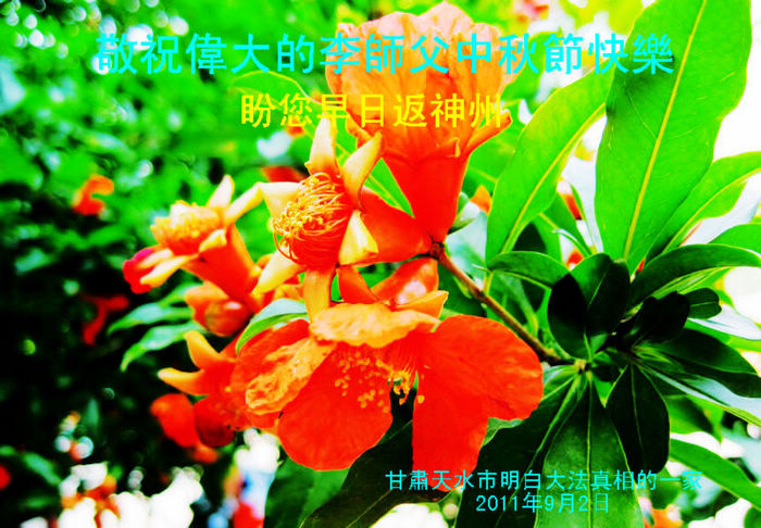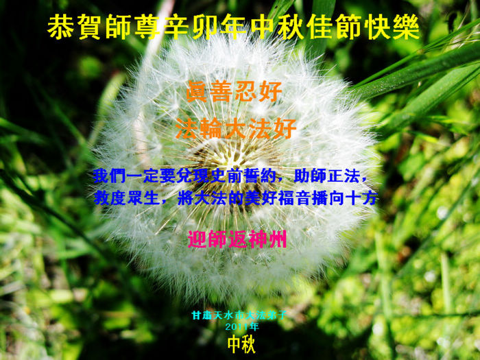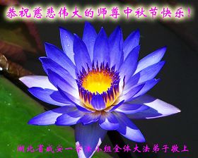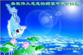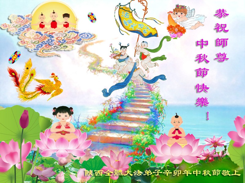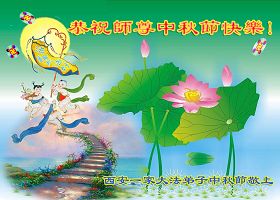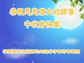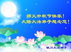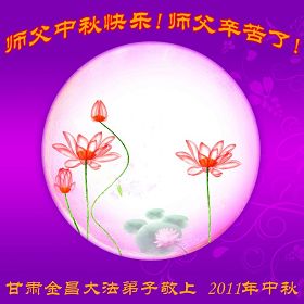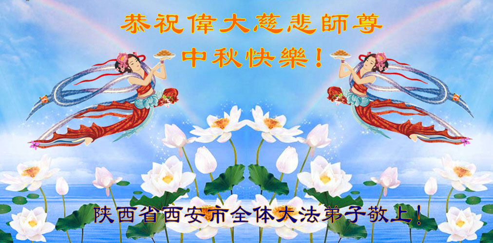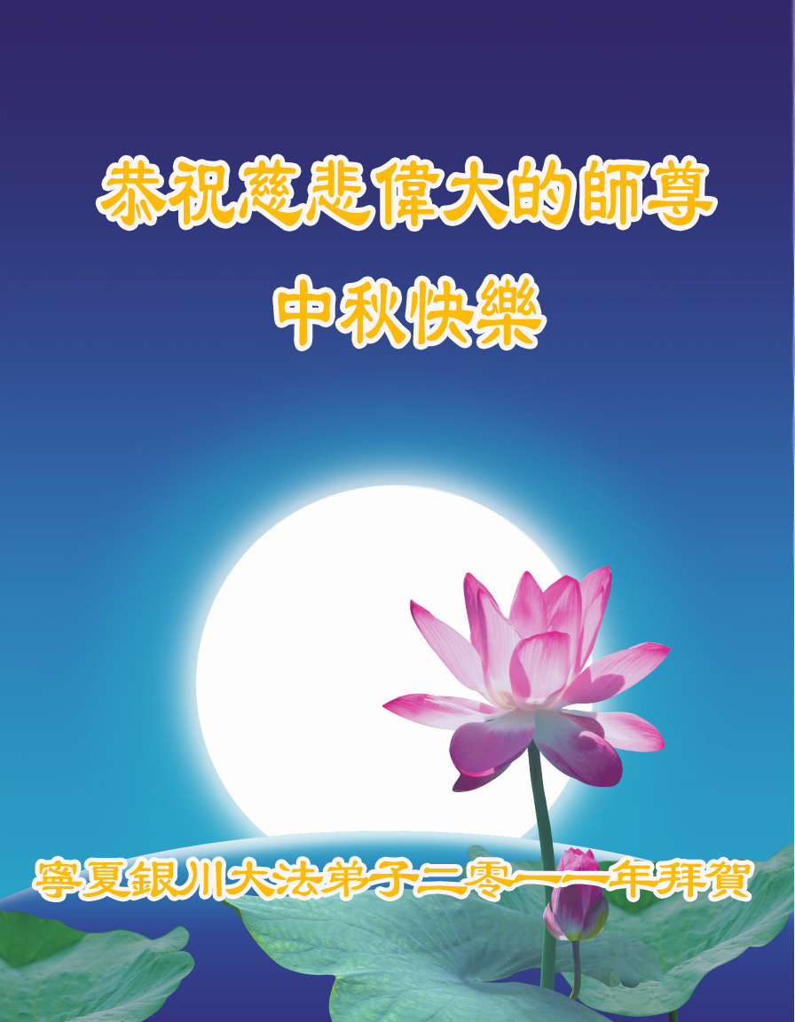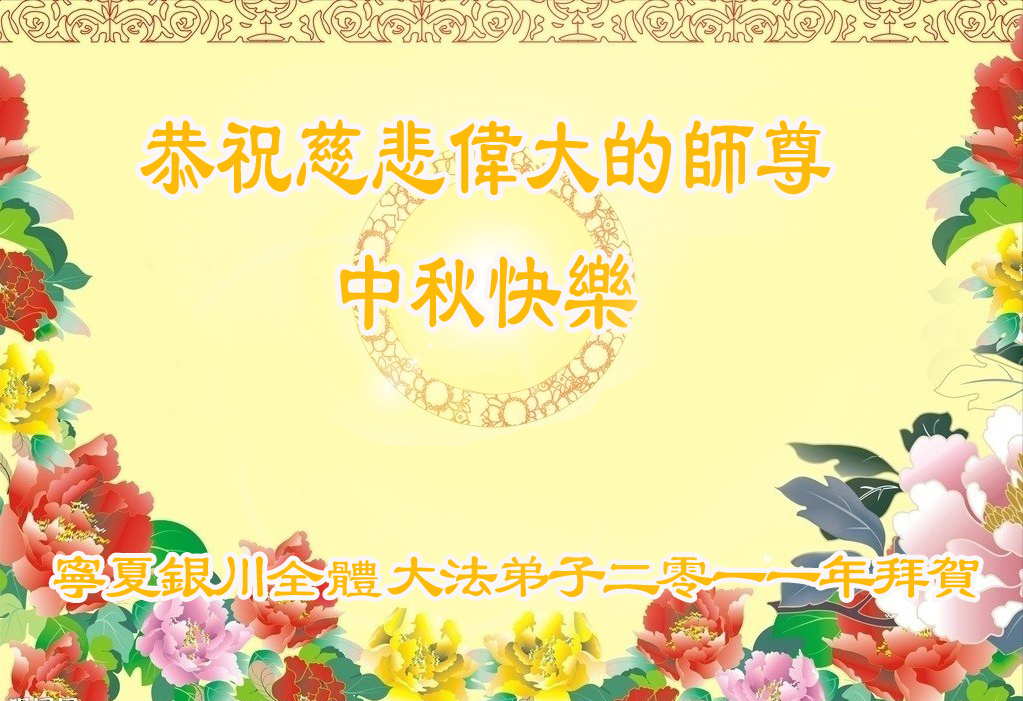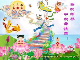宁夏全体大法弟子恭祝师尊中秋节快乐!甘肃省永登县大法弟子全家恭祝慈悲伟大的师尊中秋快乐!时光飞逝,十三年前的今天,我沐浴佛恩初闻大法。同时在梦中,我看见一辆没坐满人的大型客车,车身呈现出一米见方的两个大字“震撼”,我义无反顾的踏了上去。我明白自己终于寻找到我生生世世苦苦等待的佛法真道、终于找到了我宁愿付出我整个的青春与生命的宇宙真理。第一次听到殊胜的“真、善、忍”时,我惊叹于佛法的浩瀚、佛恩的浩荡;第一次领悟到“正法时期大法弟子”这一宇宙中最神圣的第一称号时,一种洪大而豪迈的使命感与责任感从心底油然而生;第一次念动正法口诀时,那份力可劈山的正念拔地而起,顿感邪恶灰飞烟灭…… 想想师尊的慈悲苦度,师尊对苍穹众生巨大的付出与承受,弟子怎能不泪雨滂沱?“助师正法”这一洪愿怎能不去践行? 师尊啊!您的洪恩撒满苍宇,我幸为主佛的弟子,这是何等的荣耀!何等的威德!何等的幸运!何等的殊胜! 弟子全家合十叩谢师恩!恭祝慈悲伟大的师尊中秋快乐! 西安市全体大法弟子祝师尊中秋快乐!甘肃敦煌大法弟子祝师尊中秋快乐!甘肃敦煌大法弟子向师尊问好!师尊辛苦了,师尊,您为众生承受了太多,太多,盼望师尊早日回国!祝师尊中秋快乐! 新疆汉沽大法弟子恭祝慈悲伟大的师尊中秋快乐!陕西全体大法弟子恭祝师尊中秋快乐!