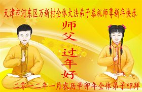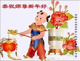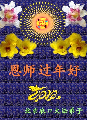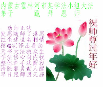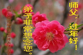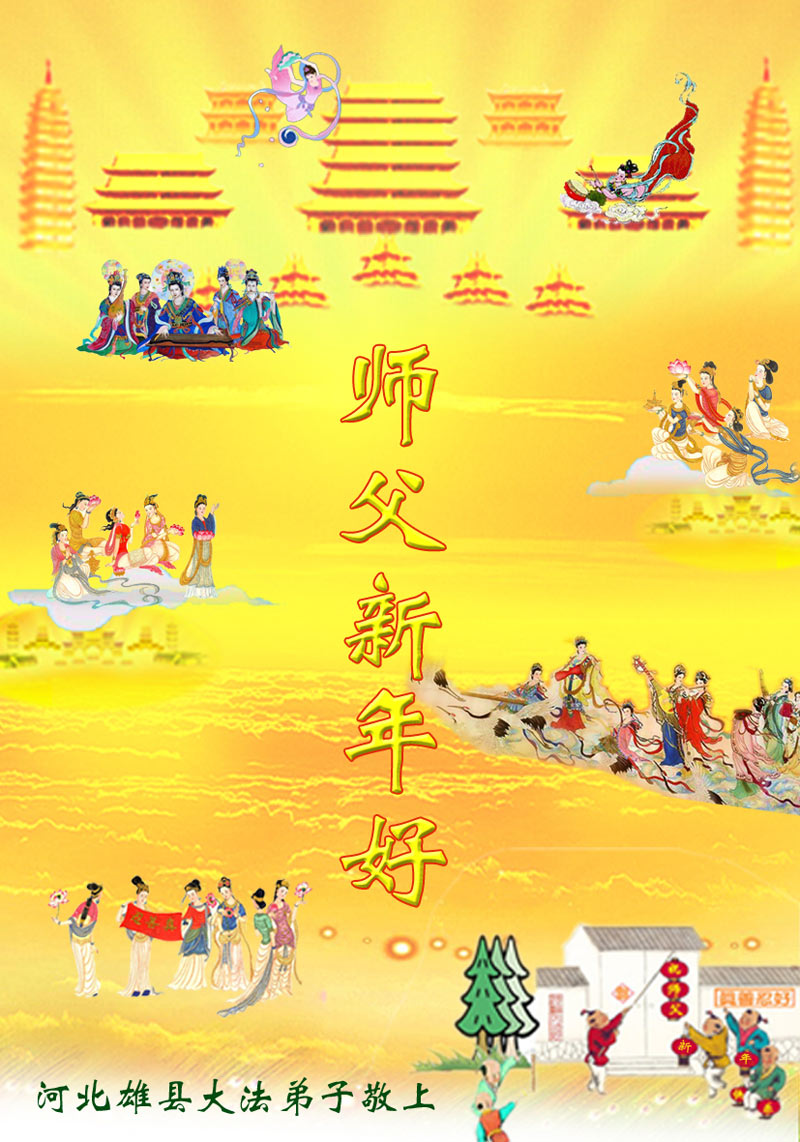 尊敬的师父好: 去旧迎新又一年 我给师父拜个年 为了众生多得度 师父一年多辛苦 弟子满身业力多 师父担业操白头 师父话要记心头 三件事情决不误 师父保重多保重 也是弟子一片心 北京大法弟子恭祝慈悲伟大的师父过年好!