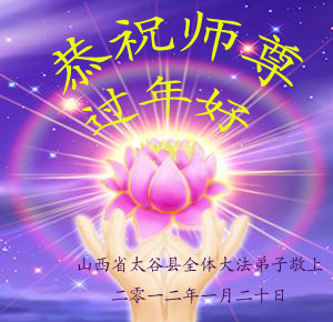 山西省太谷县全体大法弟子恭祝师尊新年快乐!在新的一年我们会更加勇猛精進,救度更多众生!紧跟师尊回家! 太谷县全体大法弟子敬上 二零一二年一月二十日 山西大同大法弟子祝师父新年愉快