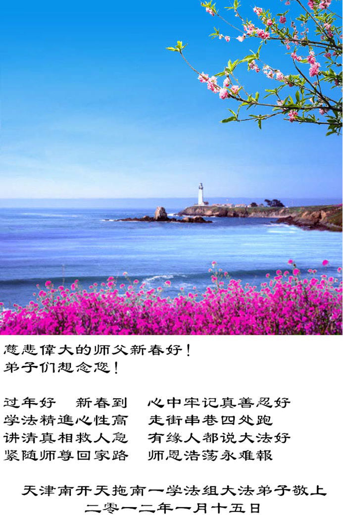 【明慧网二零一二年一月二十二日】从二零零一年开始,世界各地的大法弟子纷纷在中国新年之际,将发自内心的节日贺词、自制的贺卡、诗歌等寄给明慧网,向慈悲无私的师尊李洪志先生恭祝新年快乐。这里收集的是壬辰年(二零一二年)新年华北地区大法弟子发来的137条贺词贺卡。 天津大港大法弟子祝师尊新年好
