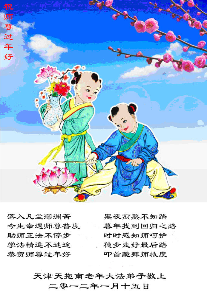 伟大的师尊好! 北京平谷区大法弟子给您拜年,祝师尊新年快乐! 我们要按师尊教诲,做好三件事,多救世人,圆满随师还。 平谷大法弟子跪拜敬上 二零一一年腊月十七日 天津天拖南老年大法弟子祝师尊过年好!