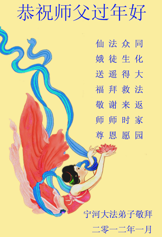 辞旧迎新新年到,想念师父心急焦。 远隔重洋路途遥,只有遥拜心意表。 千言万语语难表,问声师父新年好。 我盼师父回天朝,师徒相聚在今朝。 师父归来时已到,只等金鸡来报晓。 黑夜已过黎明到,曙光万道您回朝 师恩浩荡无以报,唯有精進来回报。 通天大道路一条,法轮世界多美妙。 河北唐山大法弟子 二零一二年元月八日 天津滨海新区汉沽大法弟子恭祝慈悲伟大的师尊新年快乐!