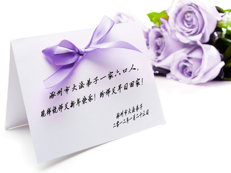 【明慧网二零一二年一月二十二日】从二零零一年开始,世界各地的大法弟子纷纷在中国新年之际,将发自内心的节日贺词、自制的贺卡、诗歌等寄给明慧网,向慈悲无私的师尊李洪志先生恭祝新年快乐。这里收集的是壬辰年(二零一二年)新年大陆大法弟子发来的部分贺词贺卡(156条)。 邯郸一学法小组全体弟子恭祝师父过年好!