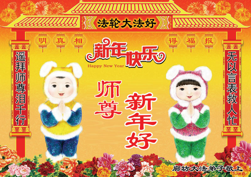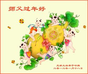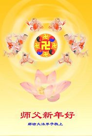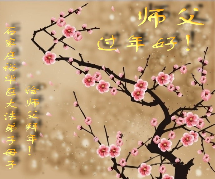 谢师恩 新年之际拜师尊 师为我们操尽心 感谢师尊慈悲度 唯有精進报师恩 西片一学法小组十名大法弟子向师尊拜年,祝师尊新年快乐! 河北涞水一弟子祝师尊新年快乐!