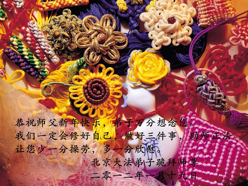 北京市朝阳区、通州区、平谷区大法弟子满怀感恩、无比敬仰的向无比神圣、无比洪大慈悲的师尊拜年,恭祝师尊新年愉快!盼望着师父多一些欣慰,少一些操劳与承受! 2012年1月18日 大陆河北省张家口市赤城县雕鄂镇大法弟子祝师父过年好!