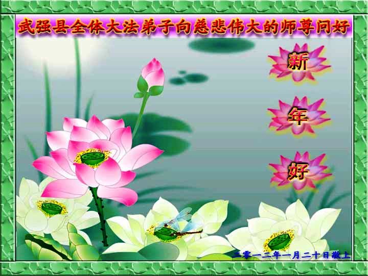 岁月匆匆,我代表山西运城永济市大法弟子恭祝伟大慈悲的师尊新年好!在新的一年里我们要做好弟子应该做的三件事。不负师尊慈悲苦度!勇猛精進,紧随师还! 河北省景县刘集乡全体大法弟子祝慈悲伟大的师尊新年快乐
