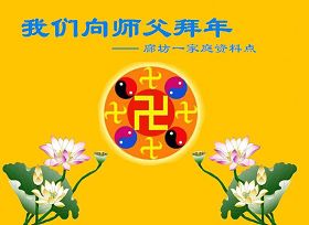 我们全家人都是96年得法的老弟子,在您的慈悲呵护下一直走在正法修炼的路上,真的无法用人类的语言表达对您的无限感恩,无限的赞颂。最近看《洪吟三》的《还原》,我落泪了,您为我们承受的太多太多了,弟子只有把您的慈悲苦度牢牢记住,永远永远永远无限的敬仰您,感恩您。并在今后的正法修炼路上,实修好自己,把救度众生的责任感、使命感落到实处,圆容师父您所要,彻底去掉私心,圆满随师父回家。在这里我代表家中所有的修炼弟子及我们学法点同修弟子祝师父您新年快乐!也代表还没修炼的先生及建筑体系众生给您拜年! 河北故城全体大法弟子恭祝师尊新年快乐!