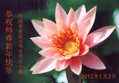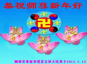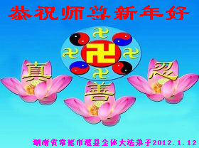在新的一年即将到来之际,众弟子给伟大的师尊跪拜:祝师尊新年快乐!弟子一定牢记师尊的教导做好三件事,救度更多的众生,随师把家还。 武汉武昌一集体学法小组 二零一二年一月十二日 郴州全体大法弟子恭祝慈悲伟大的师尊新年快乐!