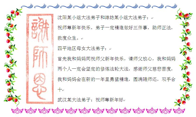 沈阳、潍坊某学法小组大法弟子:弟子一定精進做好三件事,助师正法,救度众生。 四平地区母女大法弟子:请师父放心,我和妈妈两个人一定会坚定的修炼法轮大法,感谢师父慈悲苦度,我和妈妈会在新的一年里勇猛精進,圆满随师还,双手合十 武汉某大法弟子:祝师尊新年好! 湖北鄂州市全体大法弟子给师父拜年!