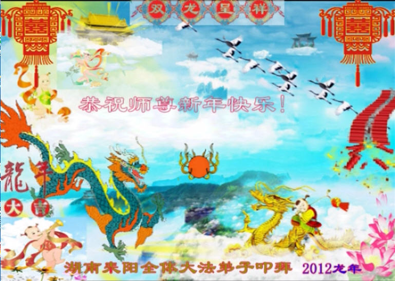 在这龙年新年即将来临之际,十堰市全体大法弟子恭祝慈悲伟大的师尊龙年新年快乐!万事如意!我们一定要谨遵师尊的教导,抓紧时间,扎扎实实的做好三件事,救度好众生,证实好大法,完成大法弟子的历史使命! 龙腾 龙腾虎跃迎新年 大法开创新纪元 法轮常转乾坤正 人神共庆师欢颜 十堰市全体大法弟子敬祝 2012年1月16日 湖南衡阳大法弟子恭祝师尊新年快乐!